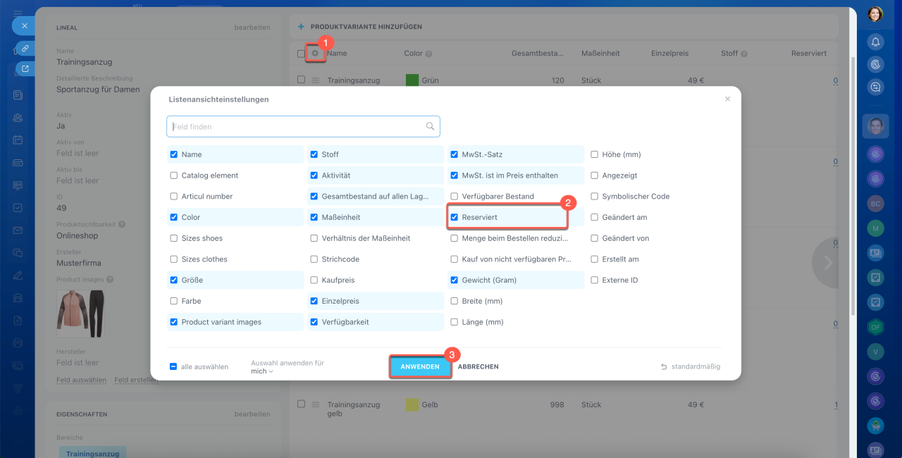 1–3. Öffnen Sie Einstellungen (⚙️) in der Tabelle der Produktvarianten, markieren Sie das Feld Reserviert und klicken Sie auf Anwenden.