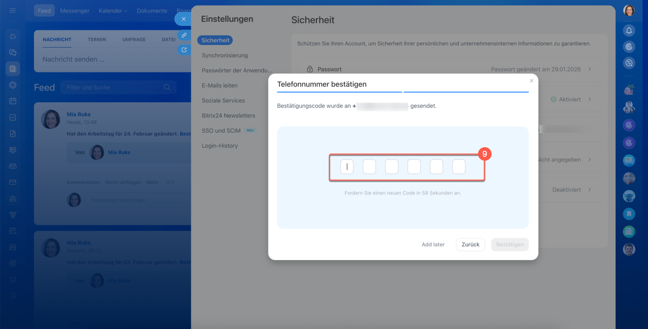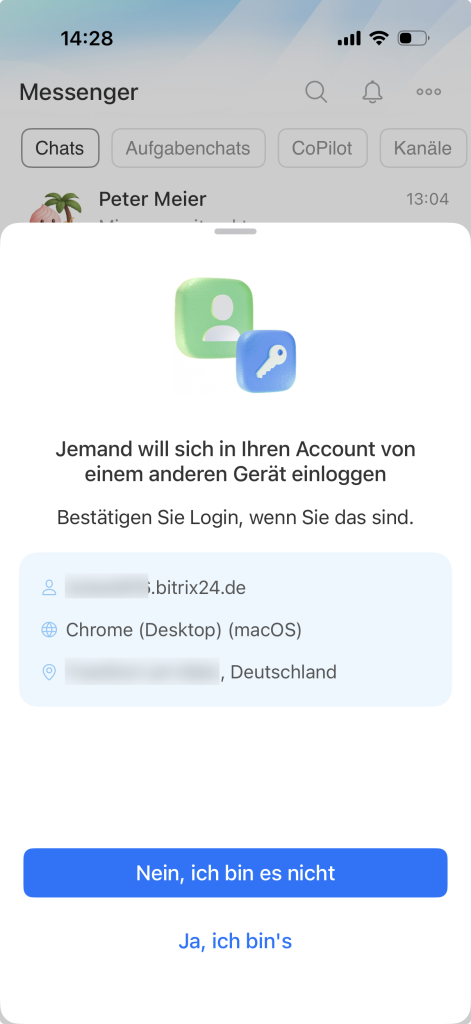 Wir haben diesen Schutzmechanismus aktualisiert und verbessert: Er ist nun einfacher und sicherer. Früher erfolgte die Bestätigung über Authentifizierungs-Apps, jetzt können Sie die mobile App von Bitrix24 oder einen Einmalcode per SMS verwenden.