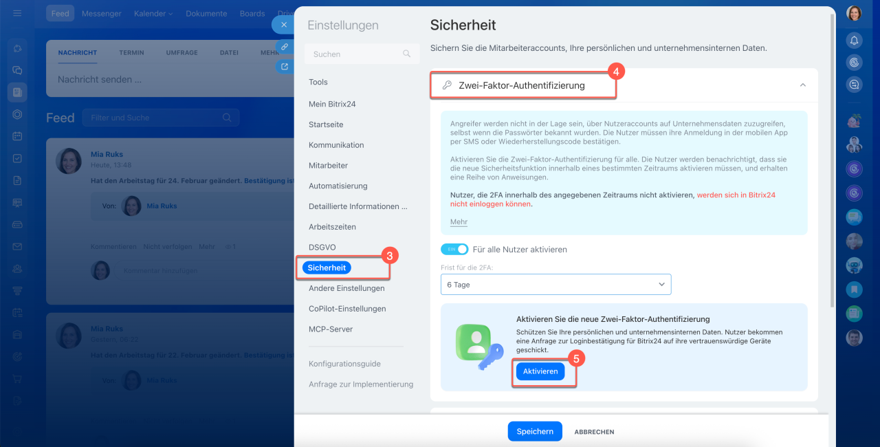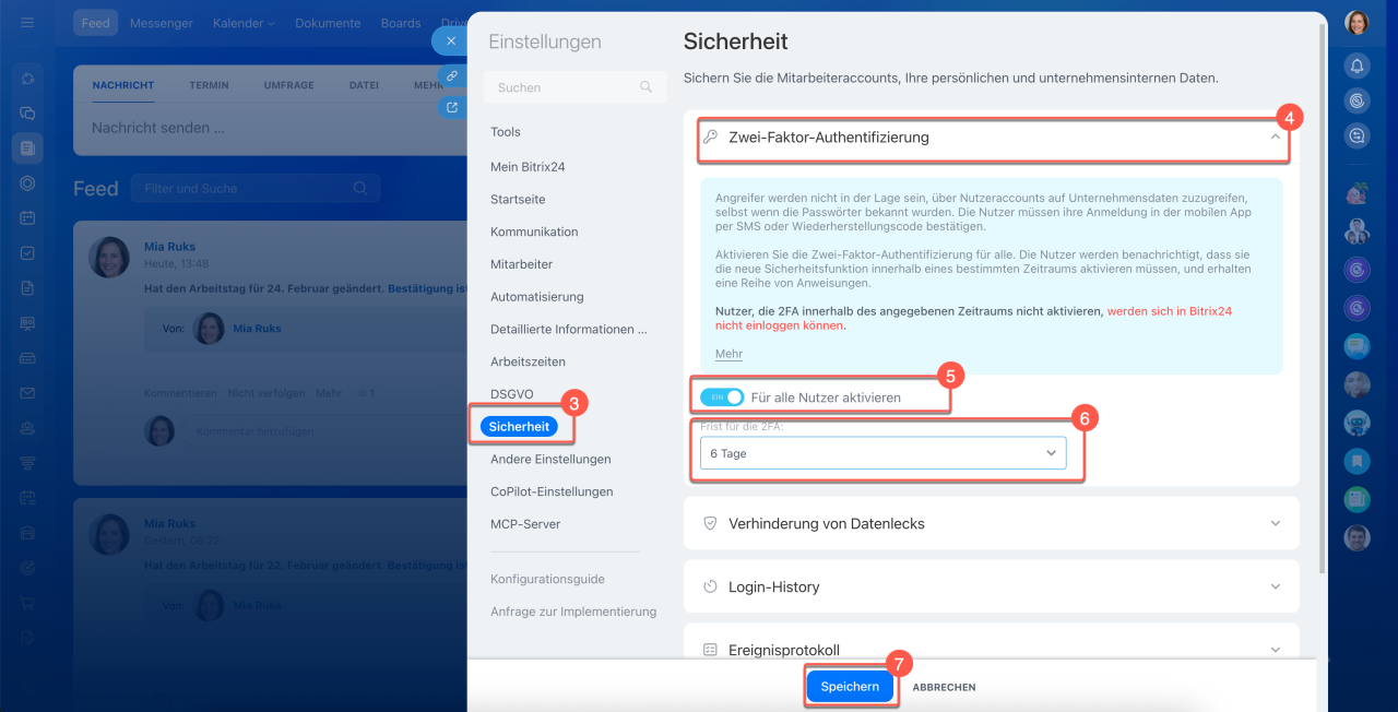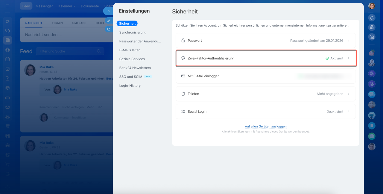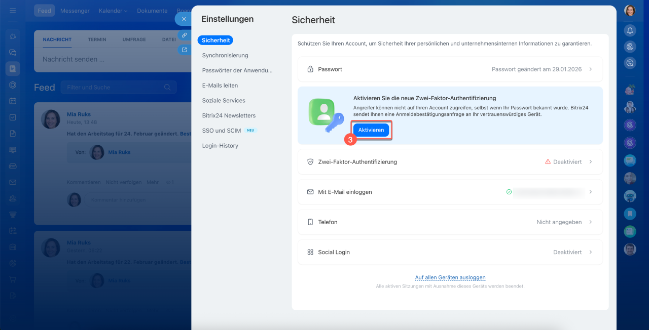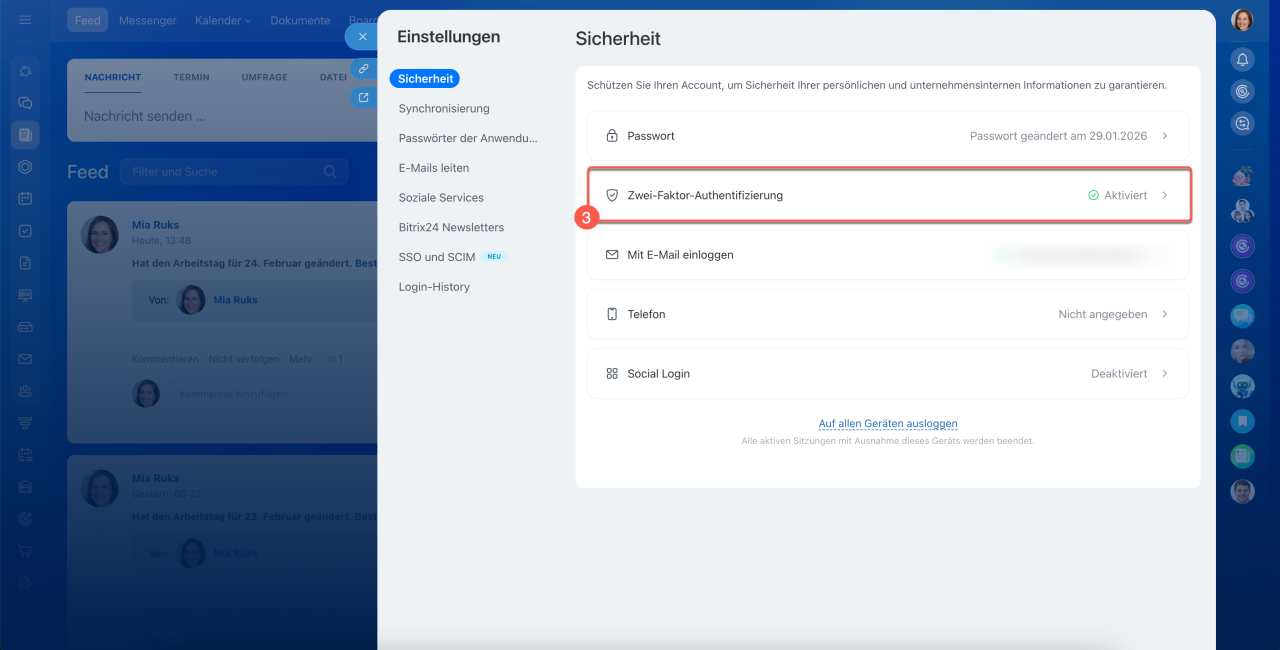 Die Zwei-Faktor-Authentifizierung bietet zusätzlichen Schutz für Ihren Bitrix24-Account: Neben Login und Passwort ist eine zweite Bestätigungsmethode erforderlich. Ohne diese Bestätigung ist ein Zugriff auf den Account nicht möglich – selbst wenn jemand Ihr Passwort kennt.