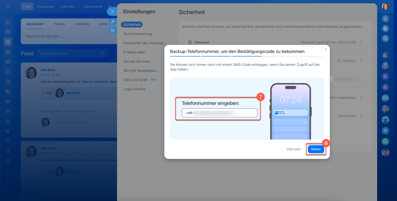 7. Geben Sie Ihre Telefonnummer an – diese wird benötigt, um sich per SMS bei Bitrix24 anzumelden, falls Sie keinen Zugriff auf Ihr Smartphone mit der installierten App haben.