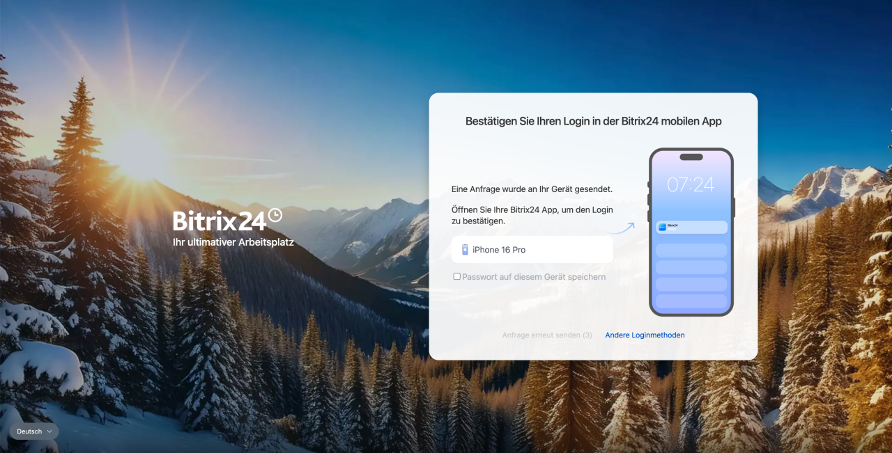 Ihre Daten sind jetzt geschützt. Um sich bei Bitrix24 anzumelden, geben Sie Ihren Login, Ihr Passwort ein und bestätigen Sie die Anmeldung in der mobilen App.