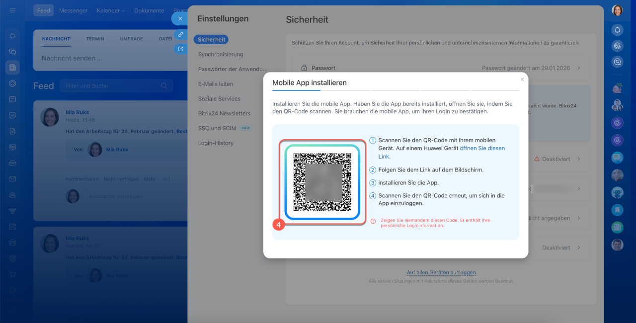 Zwei-Faktor-Authentifizierung aktivieren. Die Einrichtung der Zwei-Faktor-Authentifizierung ist für Mitarbeiter- und Administratoraccounts identisch. Installieren Sie dazu die mobile App von Bitrix24 und melden Sie sich an.