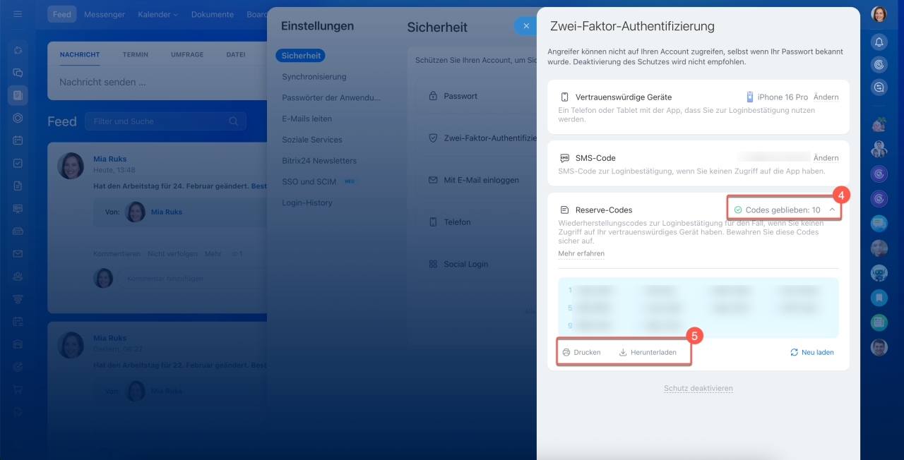 Reserve-Codes werden benötigt, wenn Sie sich nicht über die mobile App bei Bitrix24 anmelden können – z. B. bei Verlust oder Nichtverfügbarkeit Ihres Telefons. Speichern Sie die Codes unmittelbar nach der Aktivierung der Zwei-Faktor-Authentifizierung an einem sicheren Ort.
