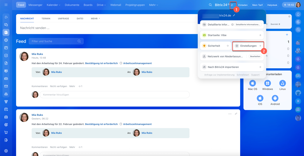 1–2. Klicken Sie auf Einstellungen (⚙️) und wählen Sie Bitrix24 aus.