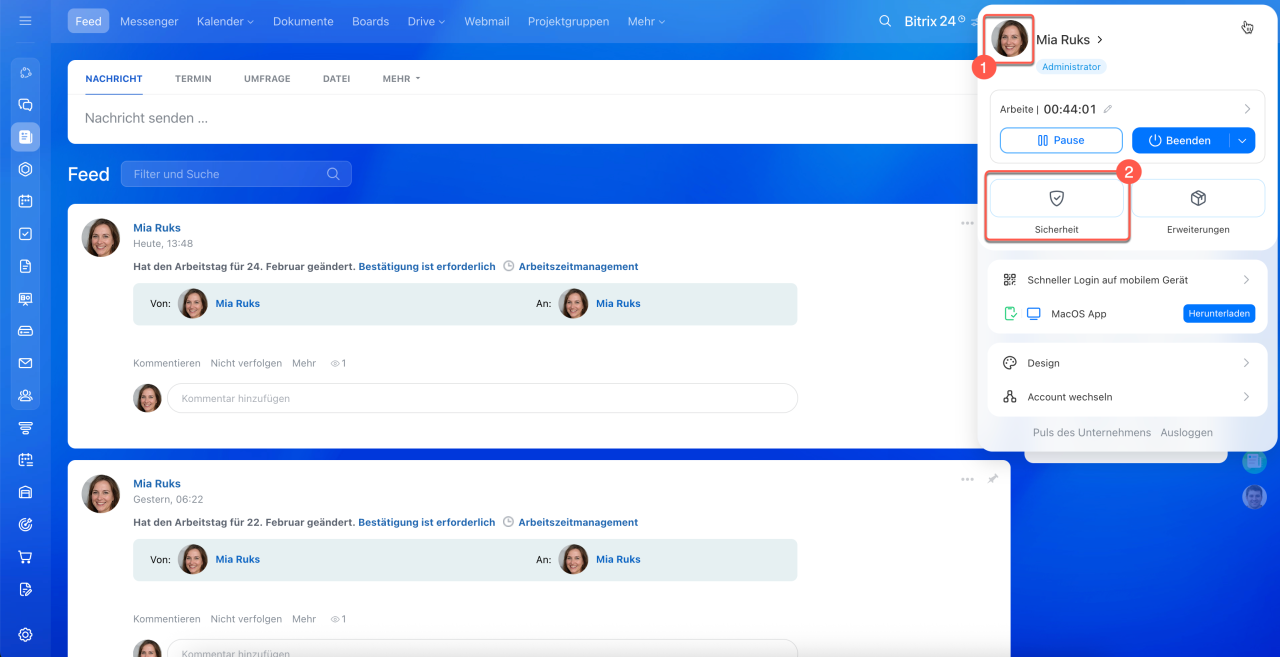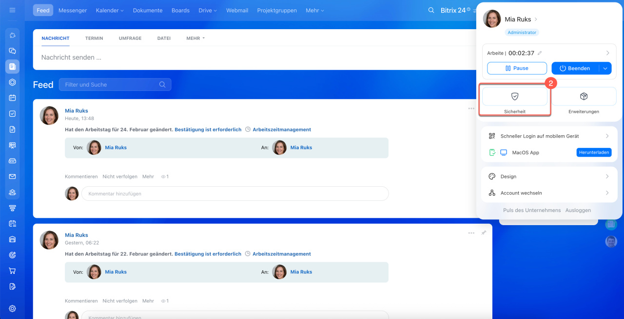 - Um die Zwei-Faktor-Authentifizierung einzurichten, installieren Sie die mobile App von Bitrix24 und melden Sie sich an. Gehen Sie in Ihrem Bitrix24-Profil auf dem Computer zu Sicherheit > Aktivieren.