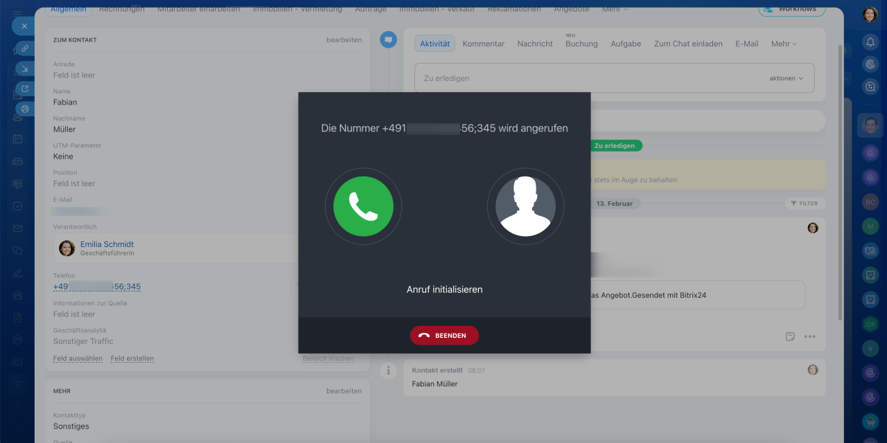 - Der Mitarbeiter ruft aus dem Formular des CRM-Elementes die Durchwahl des Kunden an.