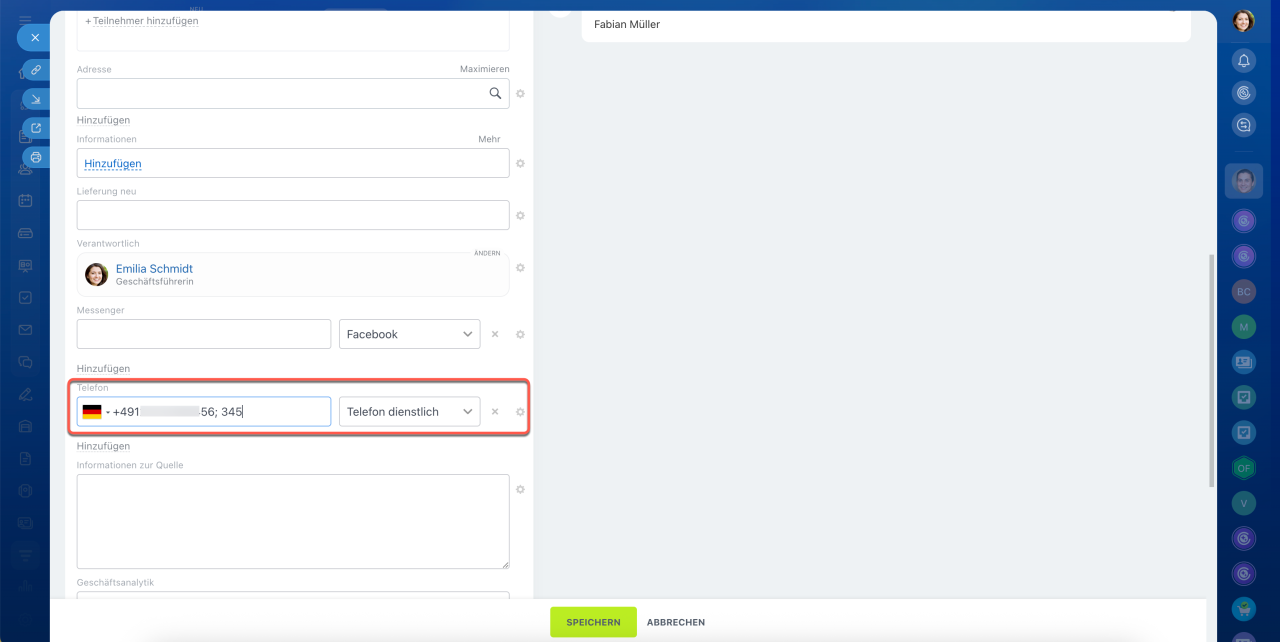 Sie können die Telefonnummer des Kunden im Formular des CRM-Elementes mit der Durchwahl speichern: Geben Sie einfach nach der Nummer das Symbol ; (Semikolon) oder # (Gitter) ein.