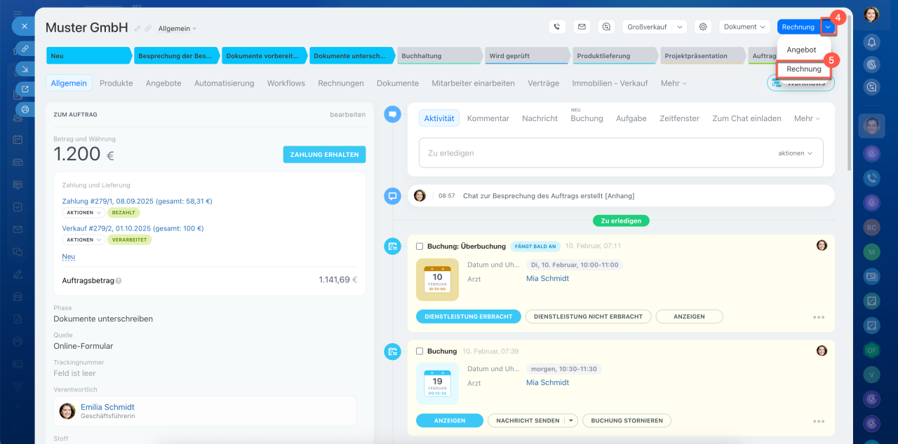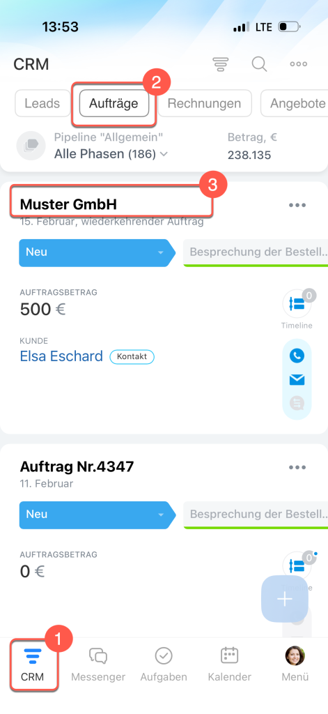 1–3. Öffnen Sie den Bereich CRM > Aufträge und wählen Sie den gewünschten Auftrag aus.