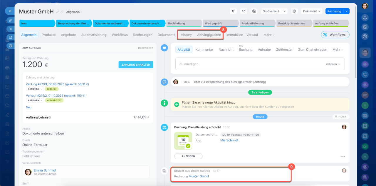 8–9. Das neu erstellte Element erscheint im Formular des ursprünglichen Auftrags – sowohl in der Timeline als auch in den Tabs History und Abhängigkeiten. Um das Formular der neuen Rechnung zu öffnen, klicken Sie einfach auf deren Namen.