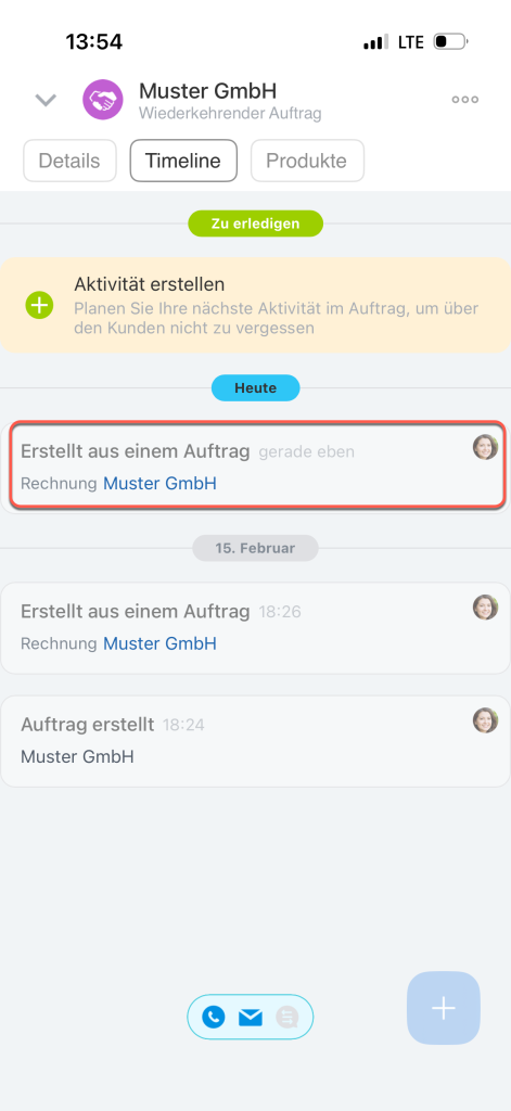 Wenn ein Kunde das Angebot geprüft hat und bereit ist, den Kauf abzuschließen, kann der Mitarbeiter direkt aus dem Angebot eine Rechnung erstellen. Das neu erstellte Element wird automatisch in der Timeline des Angebots angezeigt.