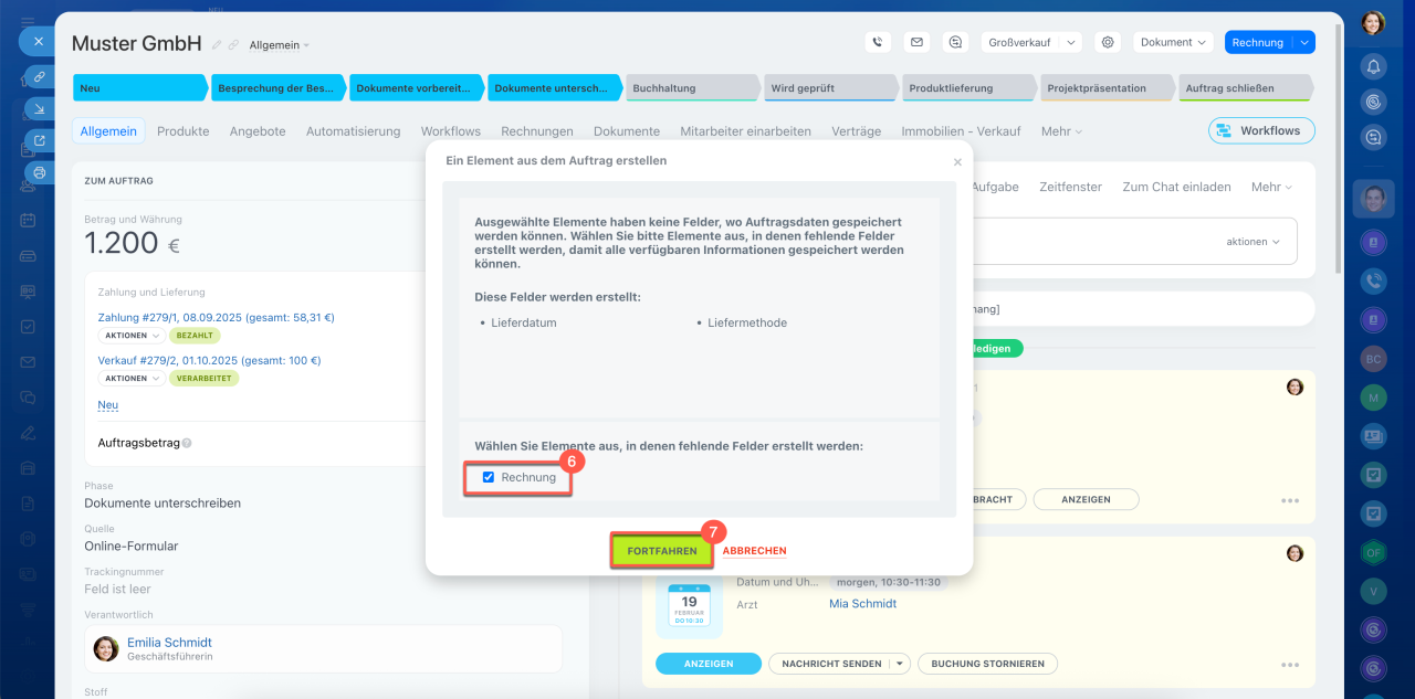 5–7. Wählen Sie Rechnung. Falls das ursprüngliche Element benutzerdefinierte Felder enthält, die im neuen Element (Rechnung) noch nicht vorhanden sind, schlägt das System vor, diese Felder anzulegen. Aktivieren Sie das Kontrollkästchen neben den entsprechenden Feldern, wenn Sie diese übernehmen möchten, und klicken Sie auf Weiter. Aus dem Auftrag wird nun eine Rechnung erstellt und das Rechnungsformular öffnet sich automatisch.