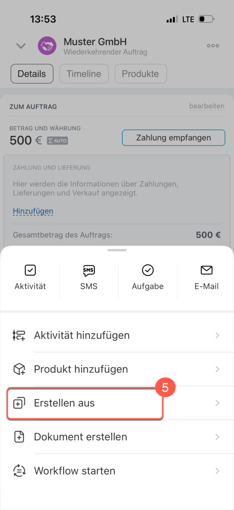 - Um ein Element aus einem anderen in der mobilen App zu erstellen, öffnen Sie den Bereich CRM > Aufträge, wählen Sie den gewünschten Auftrag aus, tippen Sie auf Plus (+), tippen Sie auf Erstelle aus und wählen Sie das gewünschte Element aus.