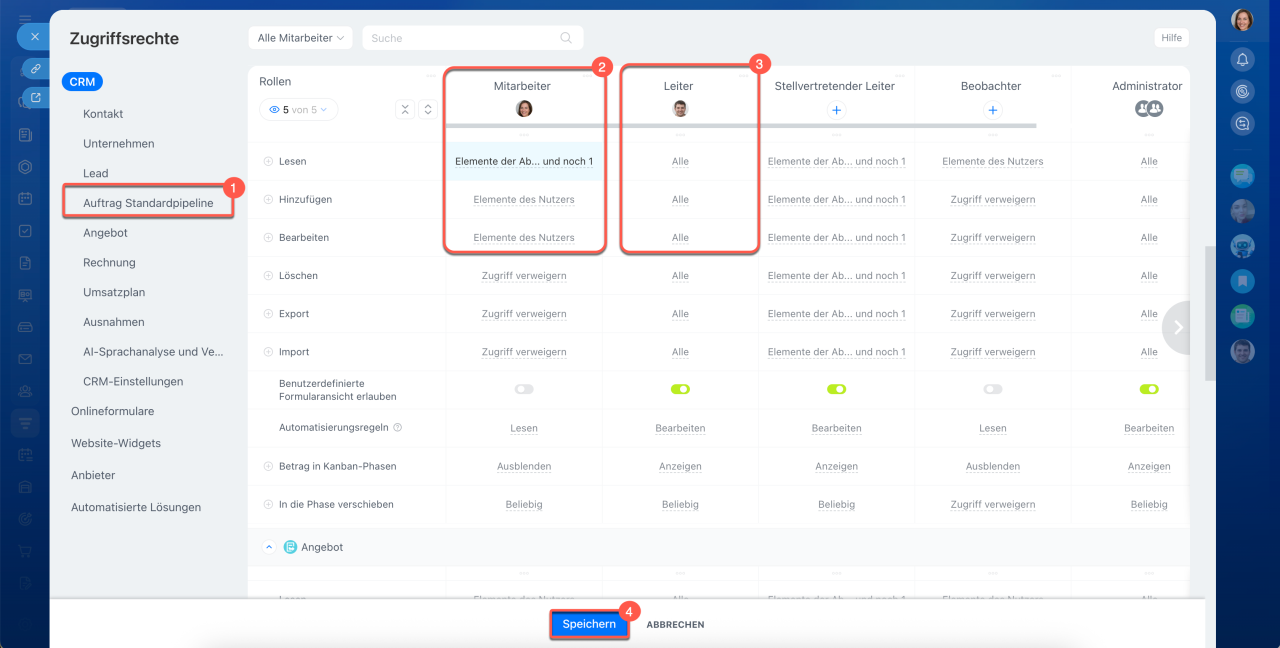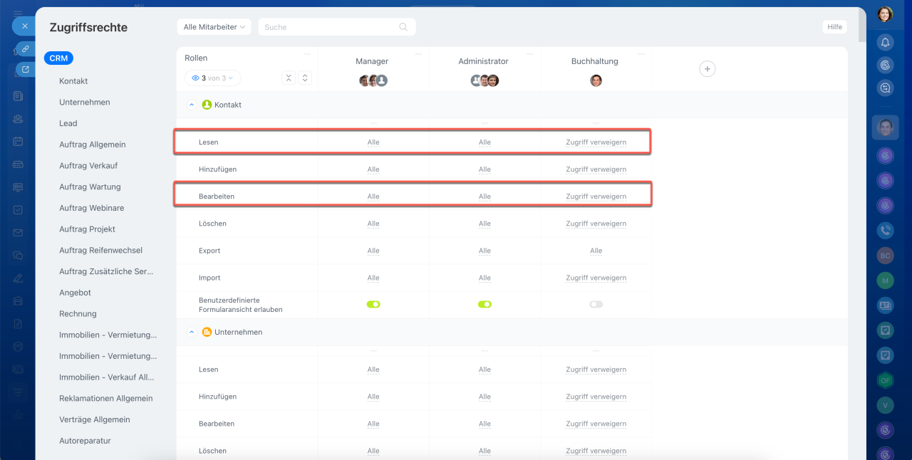 - Um Zugriffsrechte zu konfigurieren, öffnen Sie den Bereich CRM > Mehr > Einstellungen > Zugriffsrechte für CRM.