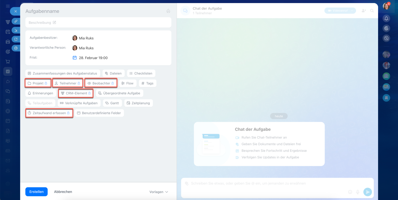 Ab der 101. Aufgabe werden diese Funktionen deaktiviert und im Interface mit einem Schloss-Symbol markiert. Die Einschränkungen gelten ausschließlich für neu erstellte Aufgaben – in bereits vorhandenen Aufgaben bleiben alle Funktionen weiterhin erhalten. Das Limit bezieht sich auf die Gesamtzahl aller erstellten Aufgaben und Teilaufgaben. Das Löschen alter Aufgaben hebt das Limit nicht auf und stellt die Funktionen nicht wieder her.