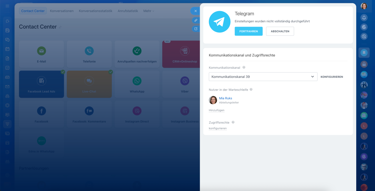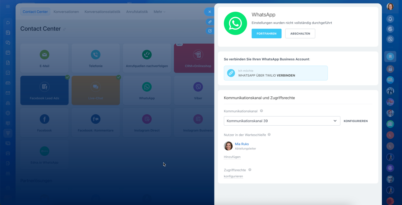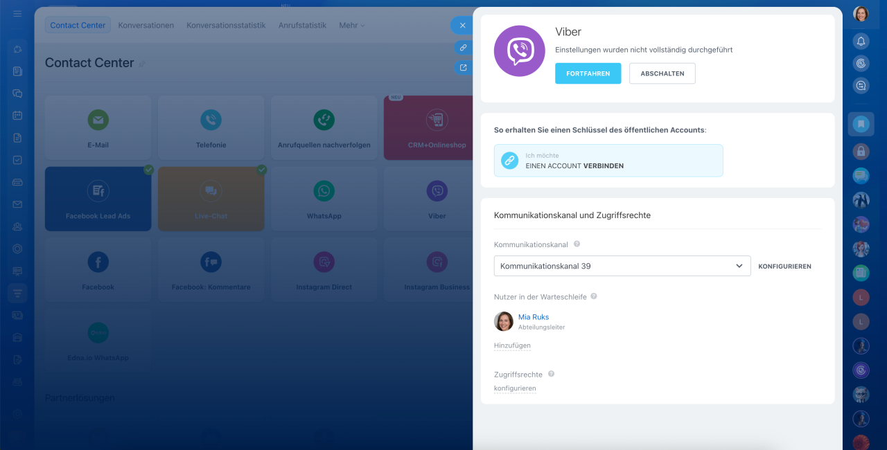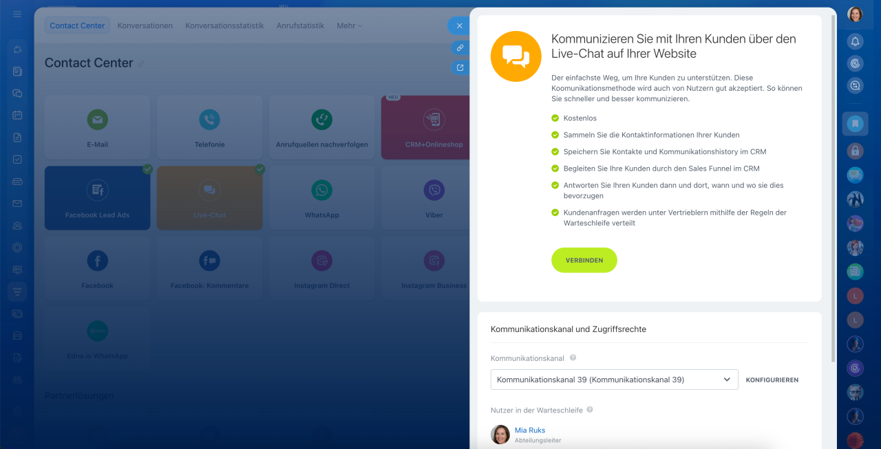 Kanäle können Sie im Bereich CRM > Kunden > Contact Center verbinden. Eine Übersicht der verfügbaren Kanäle finden Sie in der Anleitung: