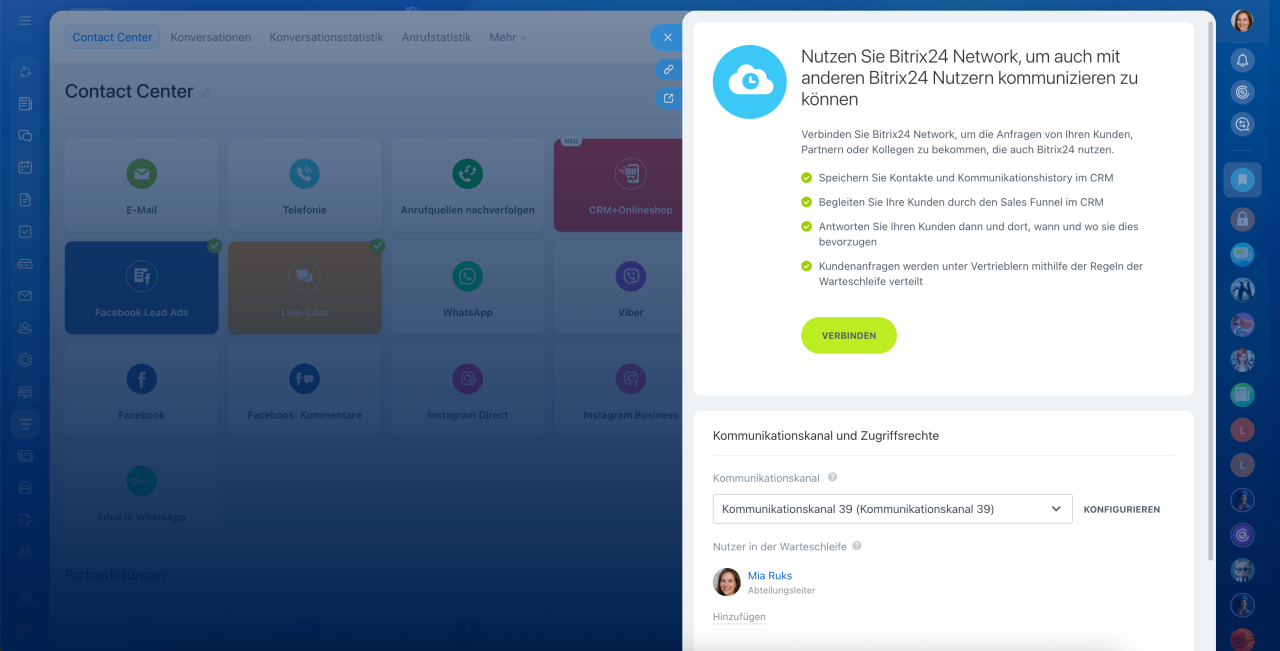 Über den Kanal Bitrix24 Network werden Nachrichten zwischen Bitrix24-Accounts ausgetauscht: Der Kunde schreibt Ihnen aus seinem eigenen Bitrix24, und die Nachricht erscheint direkt in Ihrem.