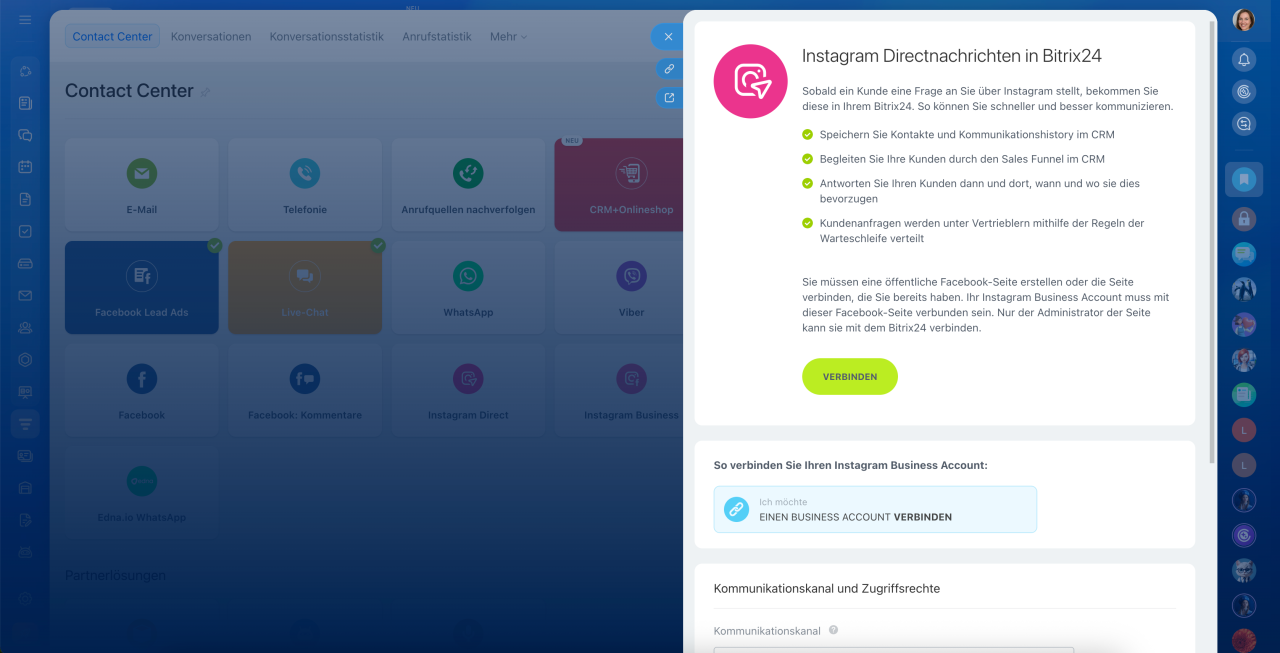 Mit Bitrix24 können Sie einen Instagram-Account verbinden. Dazu benötigen Sie einen Instagram Business-Account, der mit einer öffentlichen Facebook-Seite verknüpft ist.