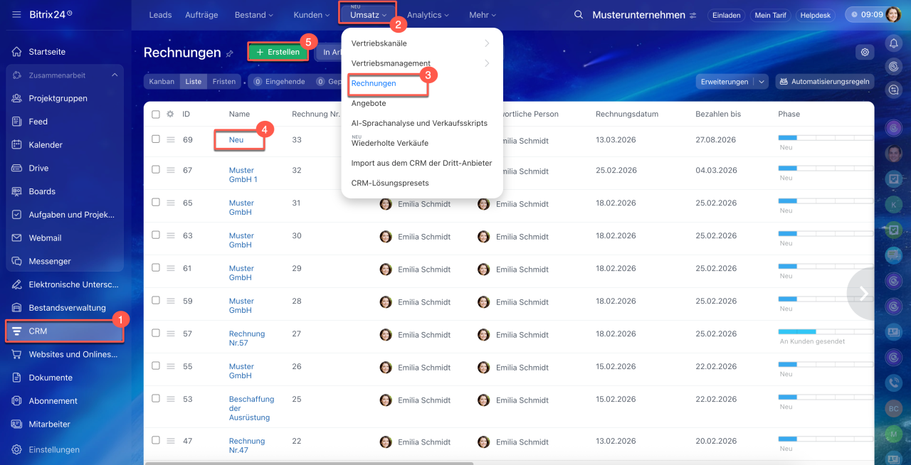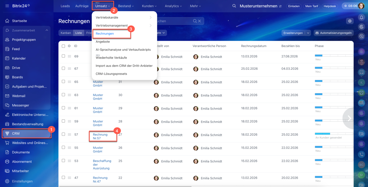 Öffnen Sie den Bereich CRM > Umsatz > Rechnungen und wählen Sie die gewünschte Rechnung aus oder erstellen Sie eine neue, indem Sie auf den Button Erstellen klicken.