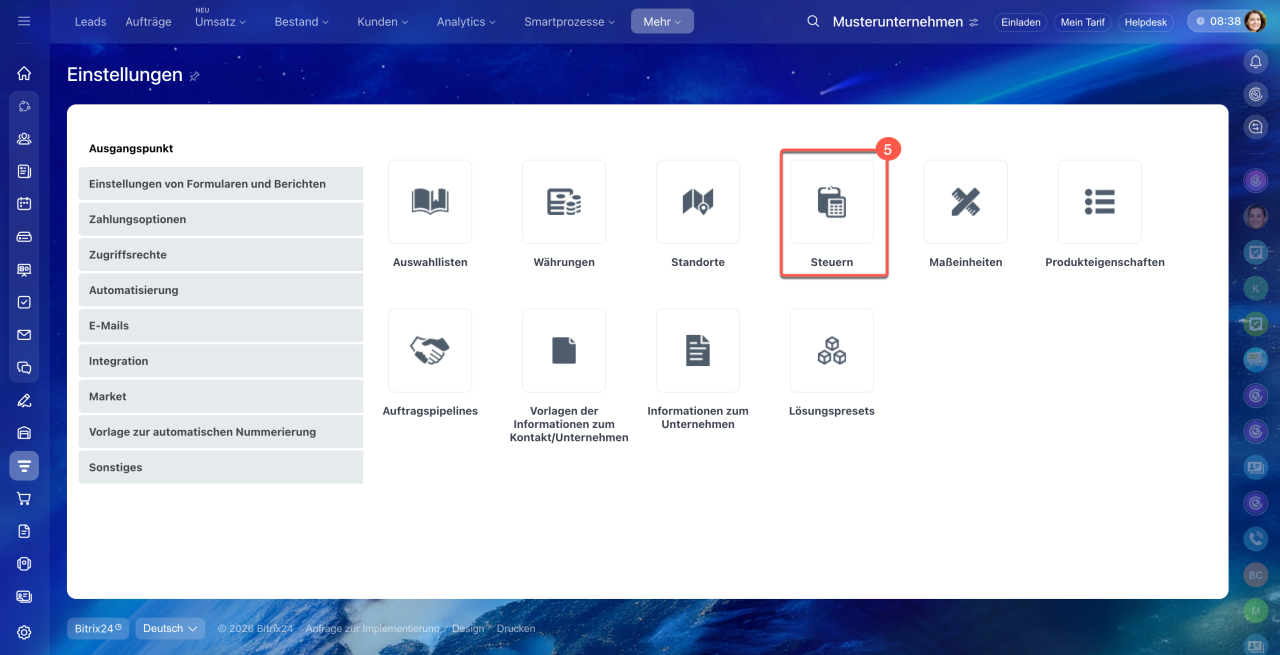 - Jede von Ihnen erstellte E-Rechnung muss mit dem entsprechenden Steuersatz verknüpft werden. Daher ist es in den CRM-Einstellungen Ihres Bitrix24 erforderlich, einen Steuersatz für die zu erstellenden Rechnungen anzulegen.