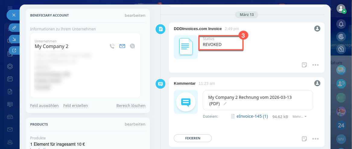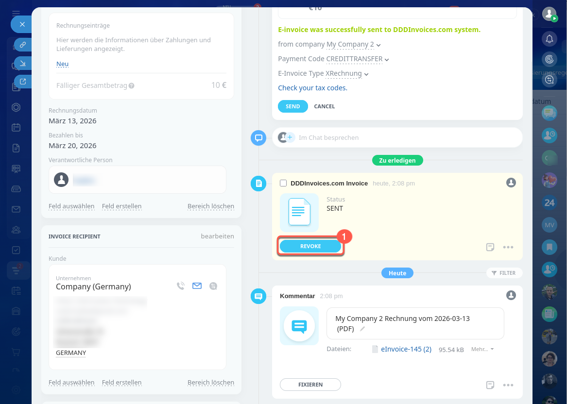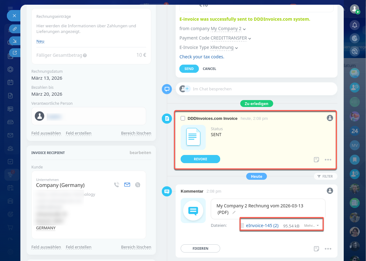 In der Timeline erscheint die Aktivität mit dem Status der übermittelten Rechnung. Unten erscheint ein Kommentar mit der gespeicherten Rechnung im PDF-Format. Bei Bedarf können Sie die Rechnung herunterladen und auf Ihrem Computer öffnen und speichern.
