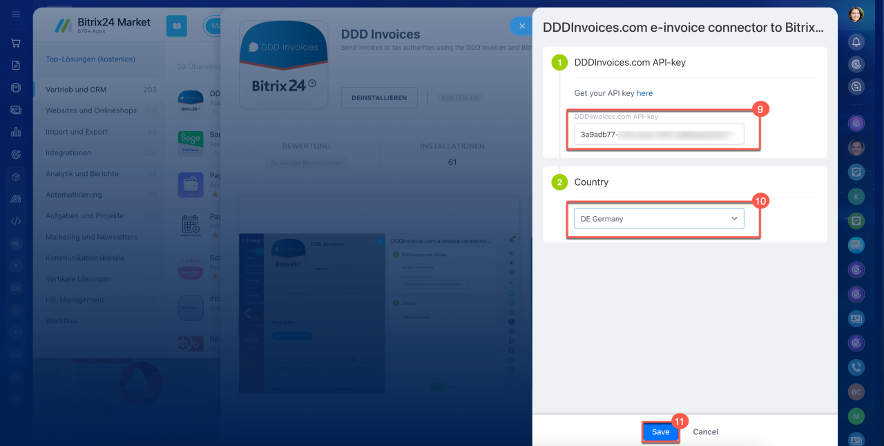 9-10. Geben Sie Ihren DDD Invoices API-Schlüssel ein und wählen Sie Ihr Land aus.