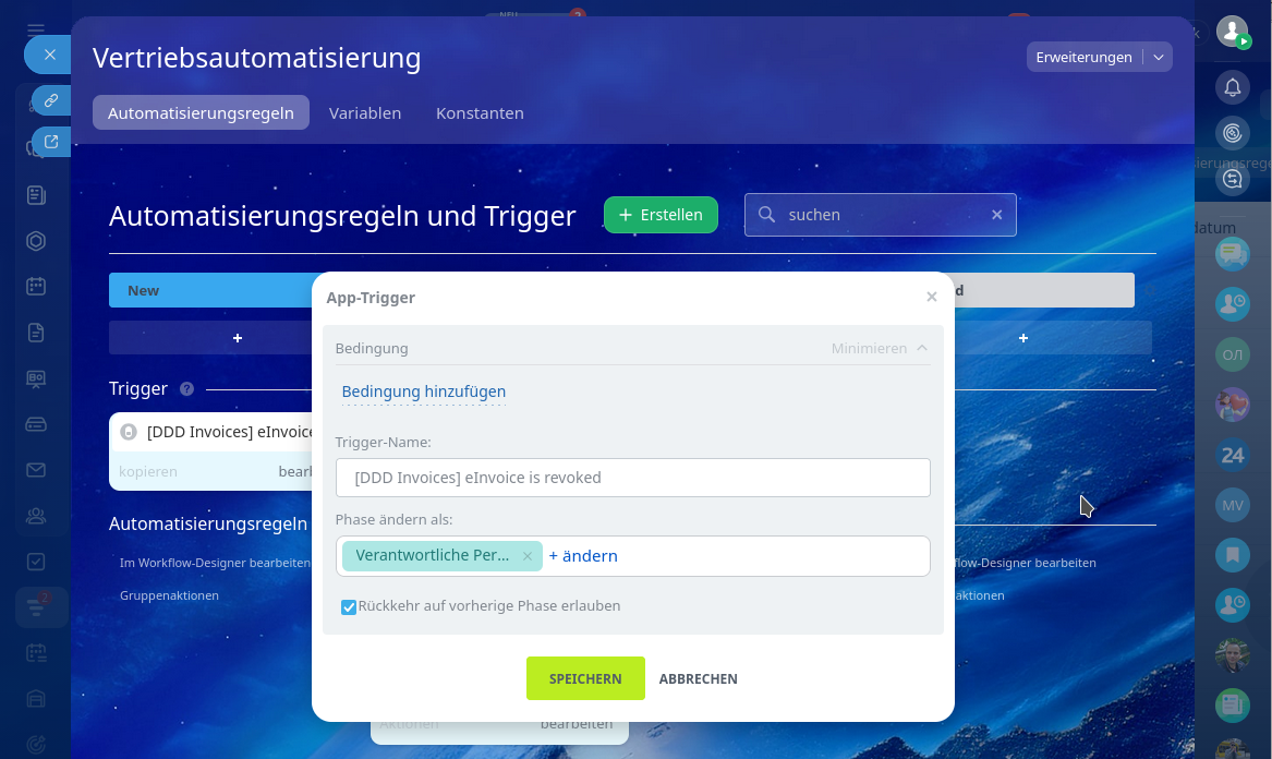 Wir haben einen Trigger erstellt, der die Rechnung bei Stornierung automatisch in die gewünschte Phase verschiebt.