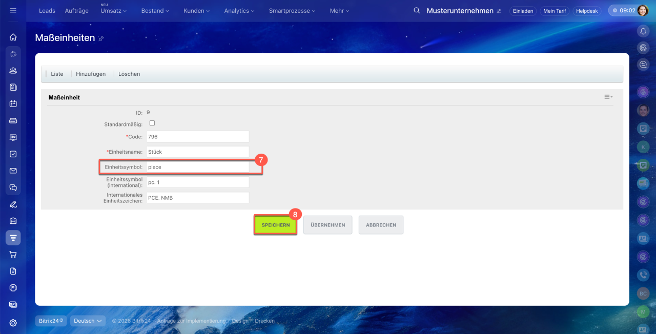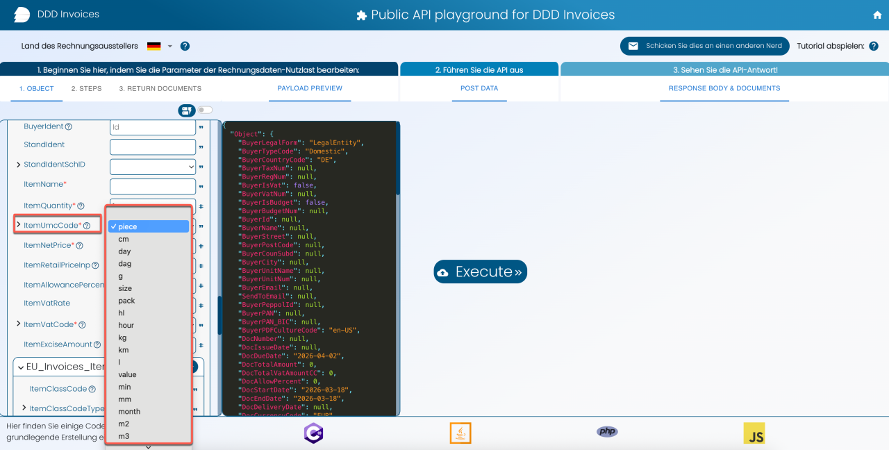 7. Fügen Sie den entsprechenden DDD Invoices UMC-Code ins Feld Einheitssymbol ein.
