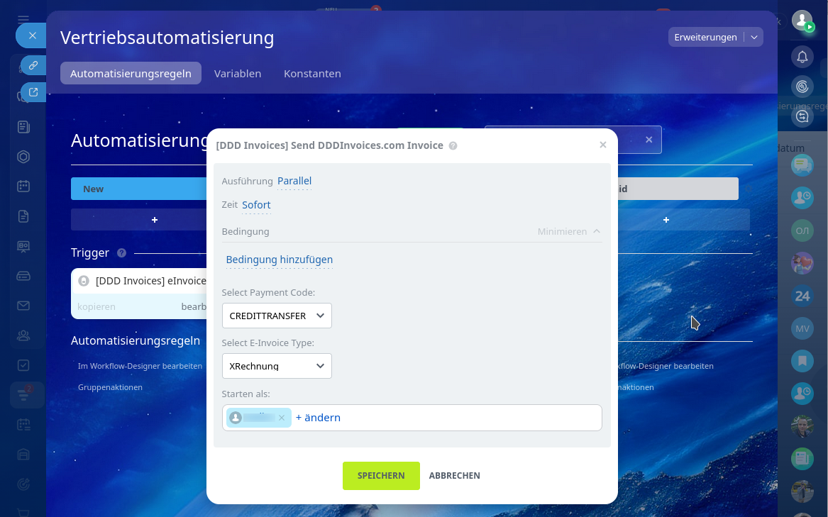 - E-Rechnungen lassen sich vollautomatisch per Automatisierungsregel versenden. Wählen Sie dazu im Block Andere die Automatisierungsregel oder den Trigger DDDInvoices aus.