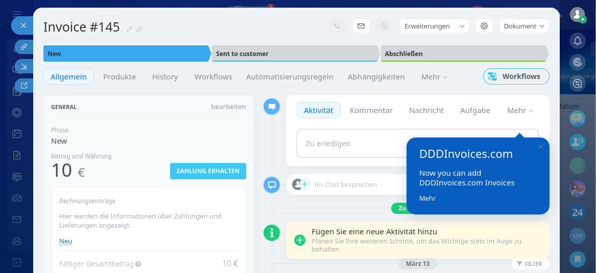 - Installieren Sie die Anwendung „DDD Invoices“ aus dem Bitrix24 Market, danach erscheint der Punkt DDDInvoices in der Timeline Ihrer Bitrix24-Rechnungen.