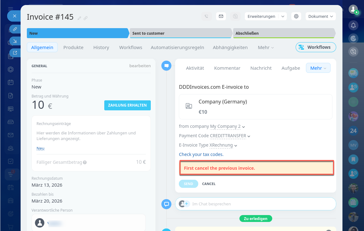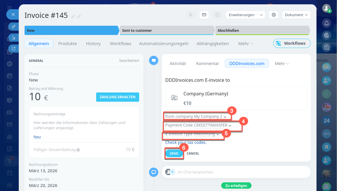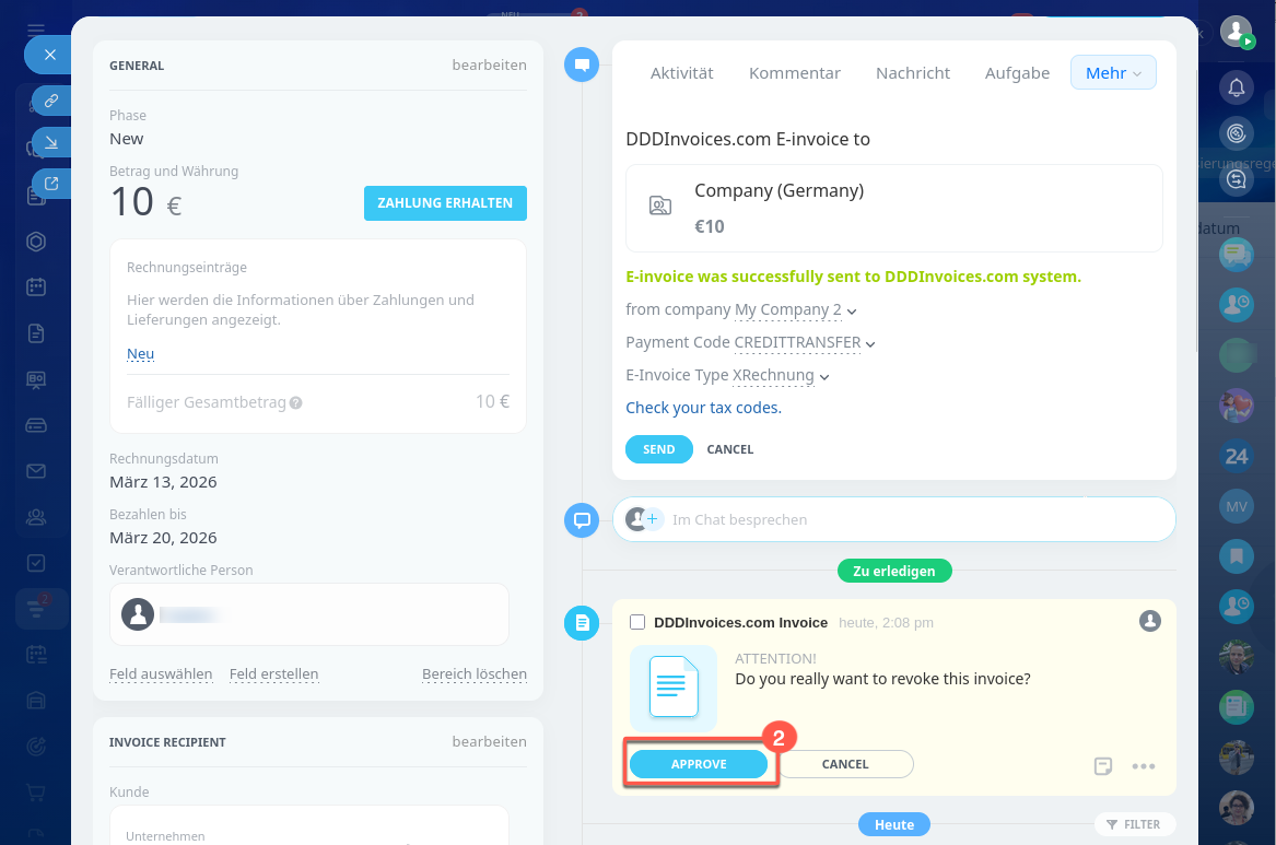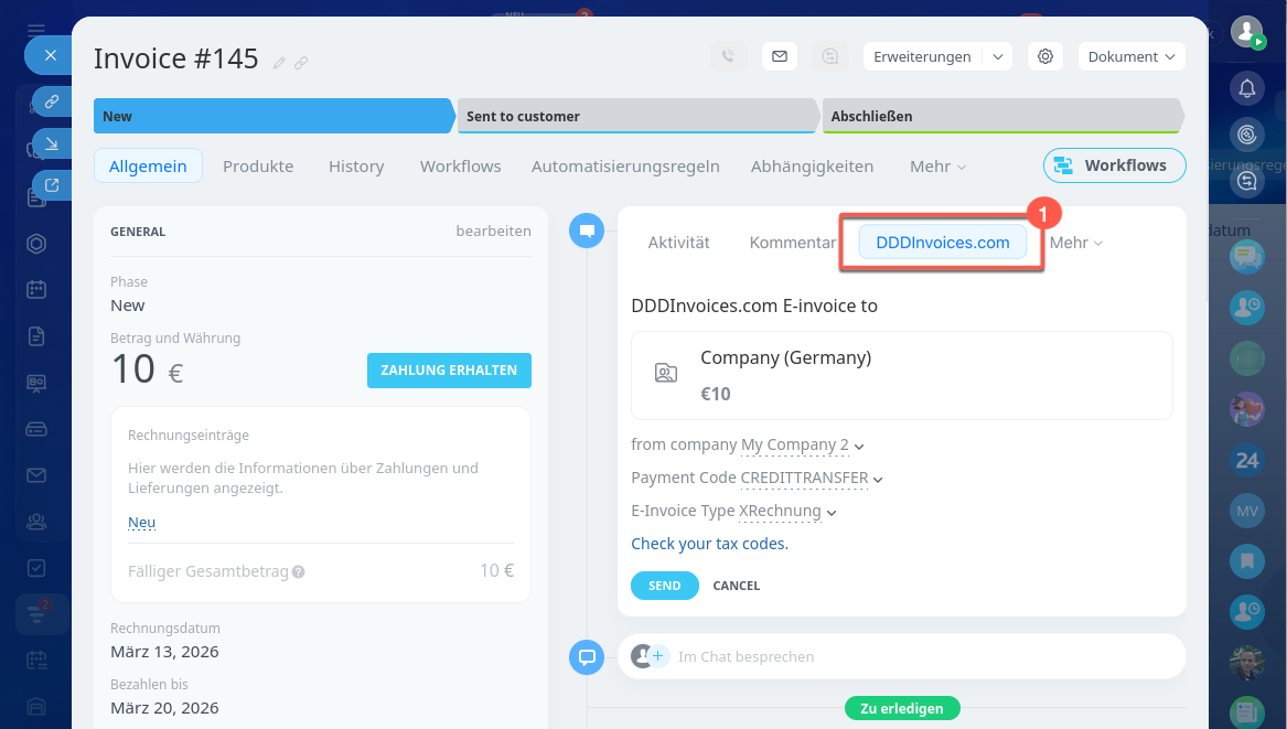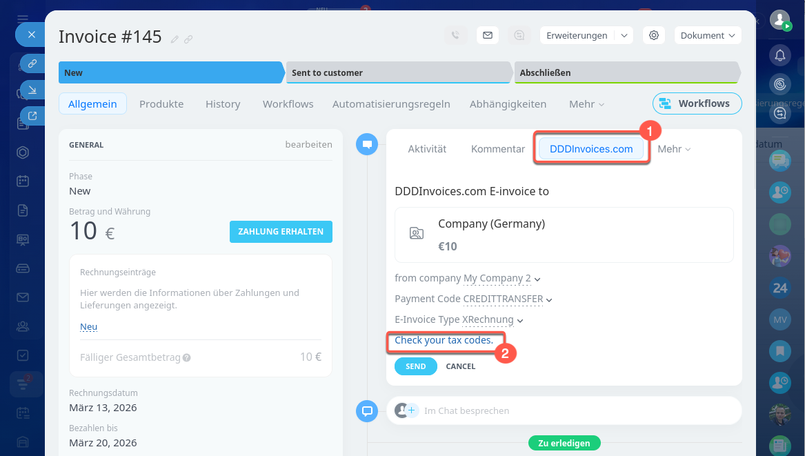 - In Bitrix24 können Sie Rechnungen direkt an Steuerbehörden senden – über die Integration von DDD Invoices.