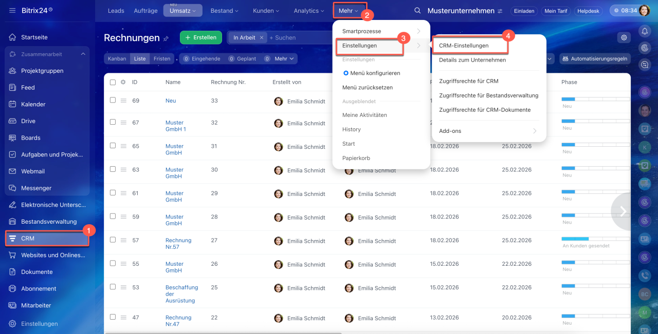 1-4. Öffnen Sie den Bereich CRM > Einstellungen > CRM-Einstellungen.