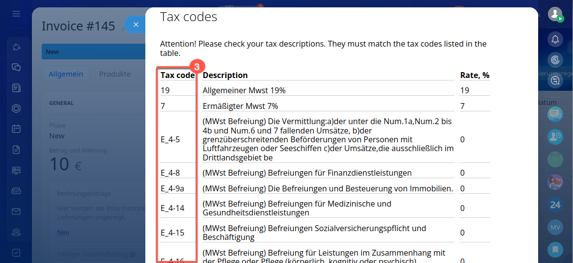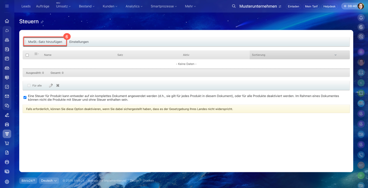 Steuersatz konfigurieren. Jede von Ihnen erstellte E-Rechnung muss mit dem entsprechenden Steuersatz verknüpft werden. Daher ist es in den CRM-Einstellungen Ihres Bitrix24 erforderlich, einen Steuersatz für die zu erstellenden Rechnungen anzulegen.