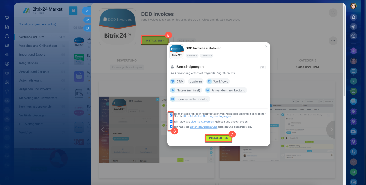 4-5. Lesen und akzeptieren Sie die Bitrix24 Market Nutzungsbedingungen, das License Agreement die Datenschutzerklärung. Klicken Sie anschließend auf Installieren.
