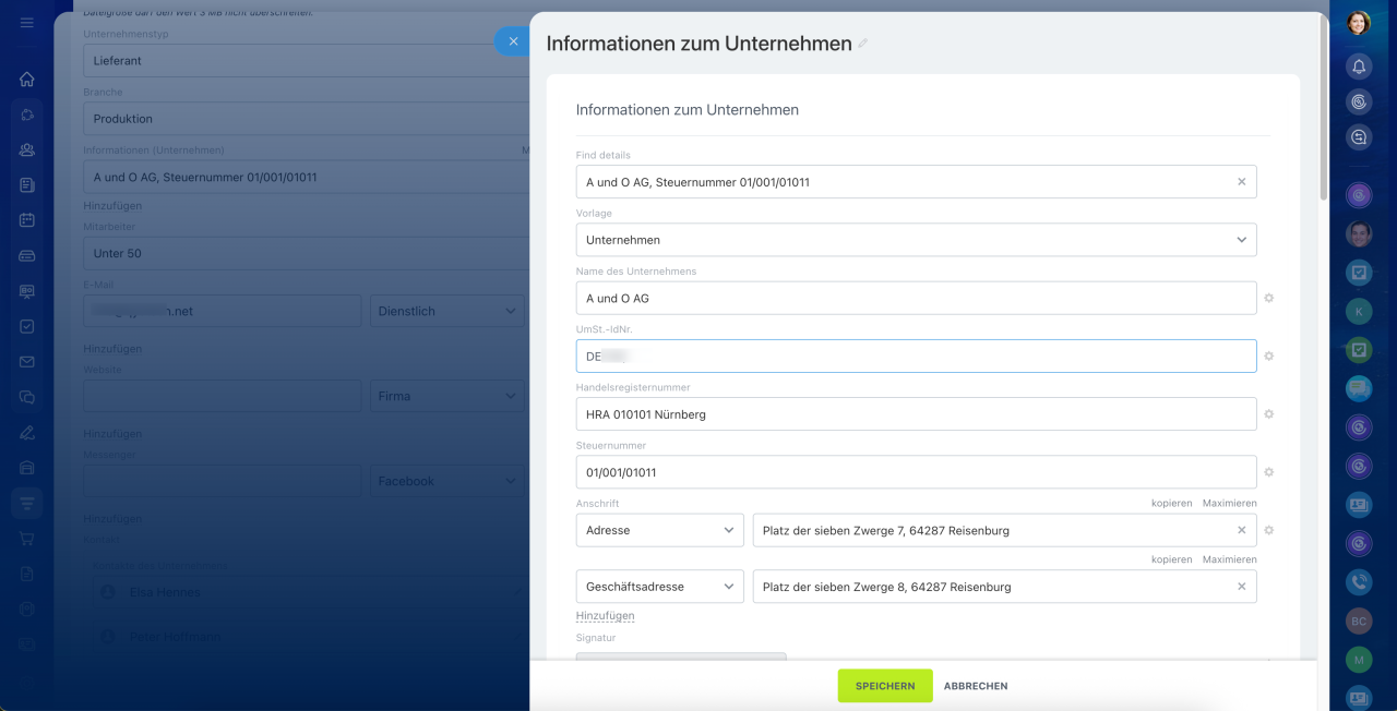 Vorlagen der Informationen zum Kontakt/Unternehmen