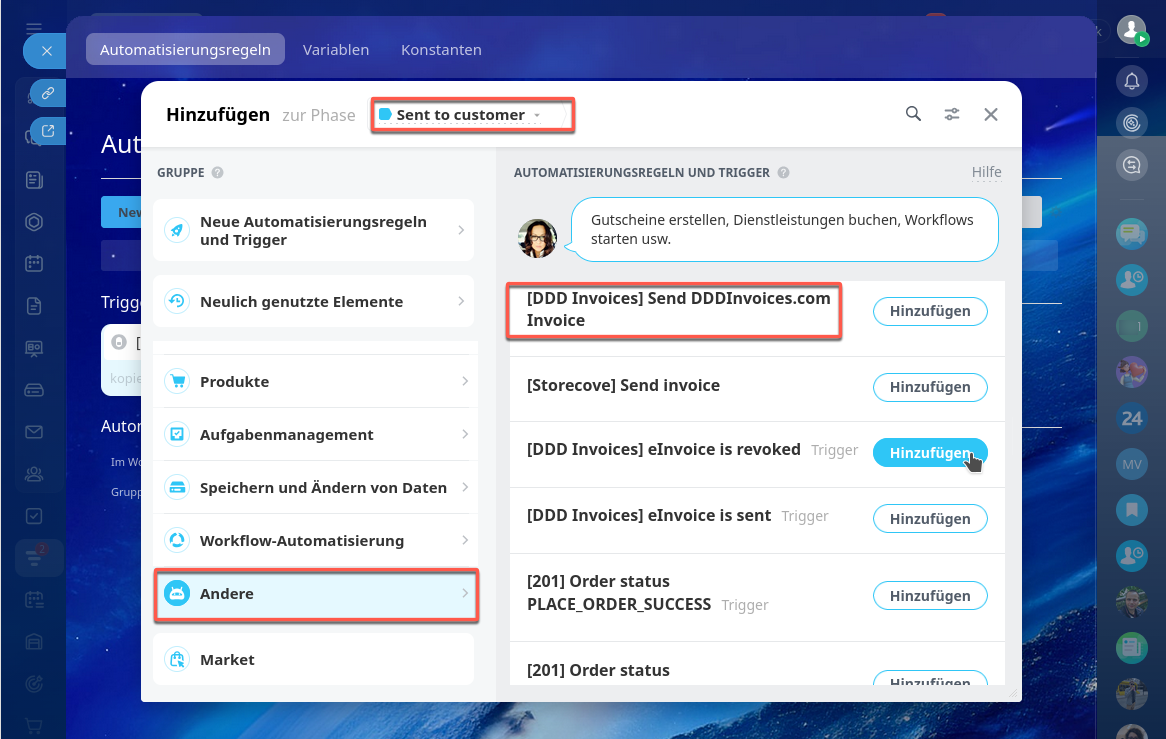 Klicken Sie auf Erstellen unter der gewünschten Phase und wählen Sie im Block Andere die Automatisierungsregel DDDInvoices aus.