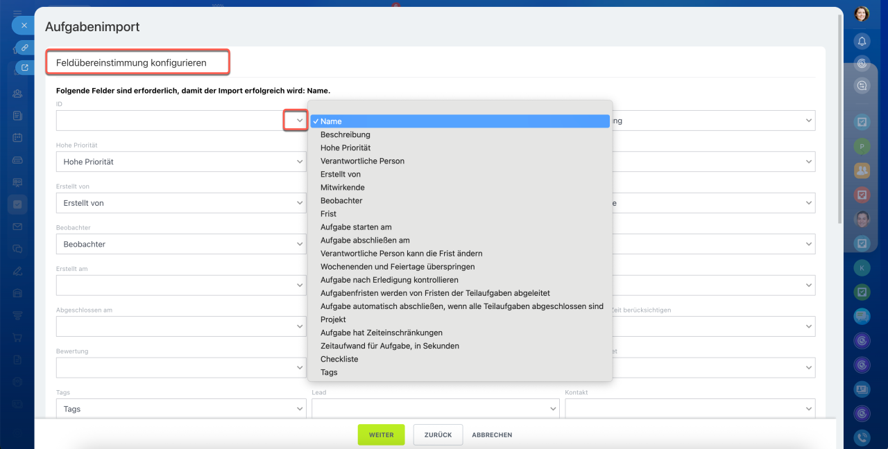 5. Überprüfen Sie die Feldzuordnung: Stellen Sie sicher, dass jedes Feld aus der CSV-Datei dem entsprechenden Feld in Bitrix24 korrekt zugeordnet ist. Beispiel: Das Feld Verantwortlicher aus der Importdatei entspricht dem Feld Verantwortlicher im Aufgabenformular.