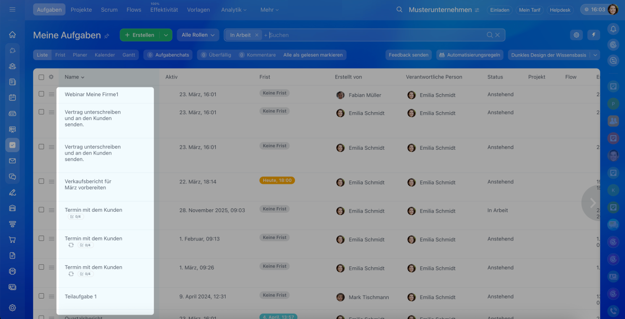 1–2. Öffnen Sie den Bereich Aufgaben und Projekte und wählen Sie die Ansicht Liste.
