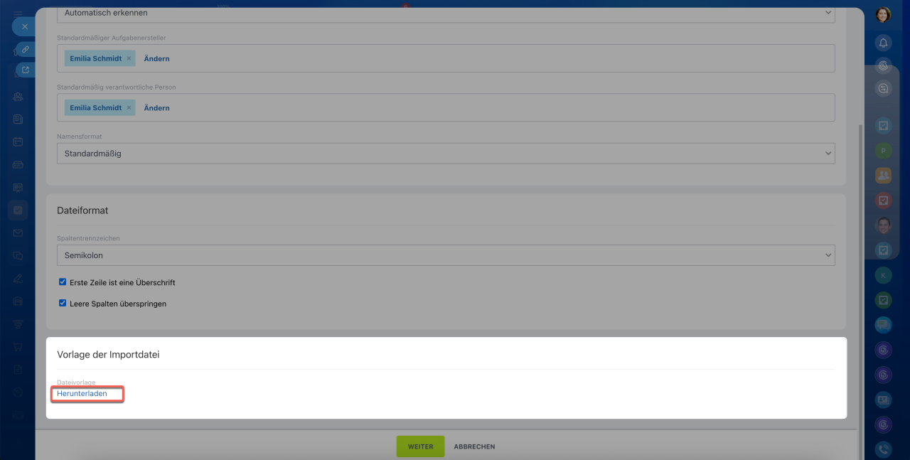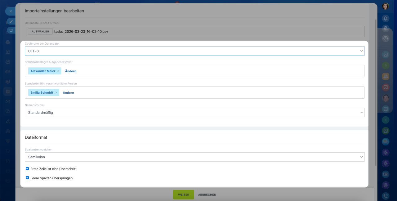 - Namensformat – Bestimmt, wie Bitrix24 die in der Datei angegebenen Mitarbeiter erkennt. Falls die Namen im Format „Vorname Nachname“ vorliegen, wählen Sie den entsprechenden Typ aus. Bei uneinheitlicher Formatierung belassen Sie die Einstellung auf Standard.