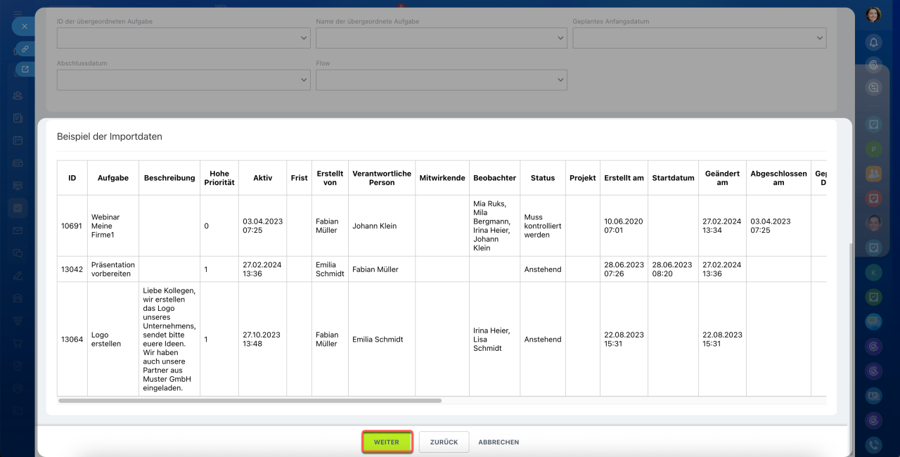 Im Bereich Beispiel der importierten Daten werden Daten aus Ihrer Datei angezeigt. So können Sie prüfen, ob die Spalten korrekt erkannt und den Aufgabenfeldern richtig zugeordnet sind.