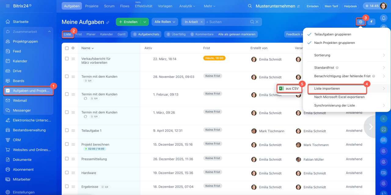 Der Import ermöglicht das Hochladen von Aufgaben in Bitrix24. Mit dieser Funktion können Sie eine große Anzahl von Aufgaben schnell und ohne manuelle Eingabe übertragen.