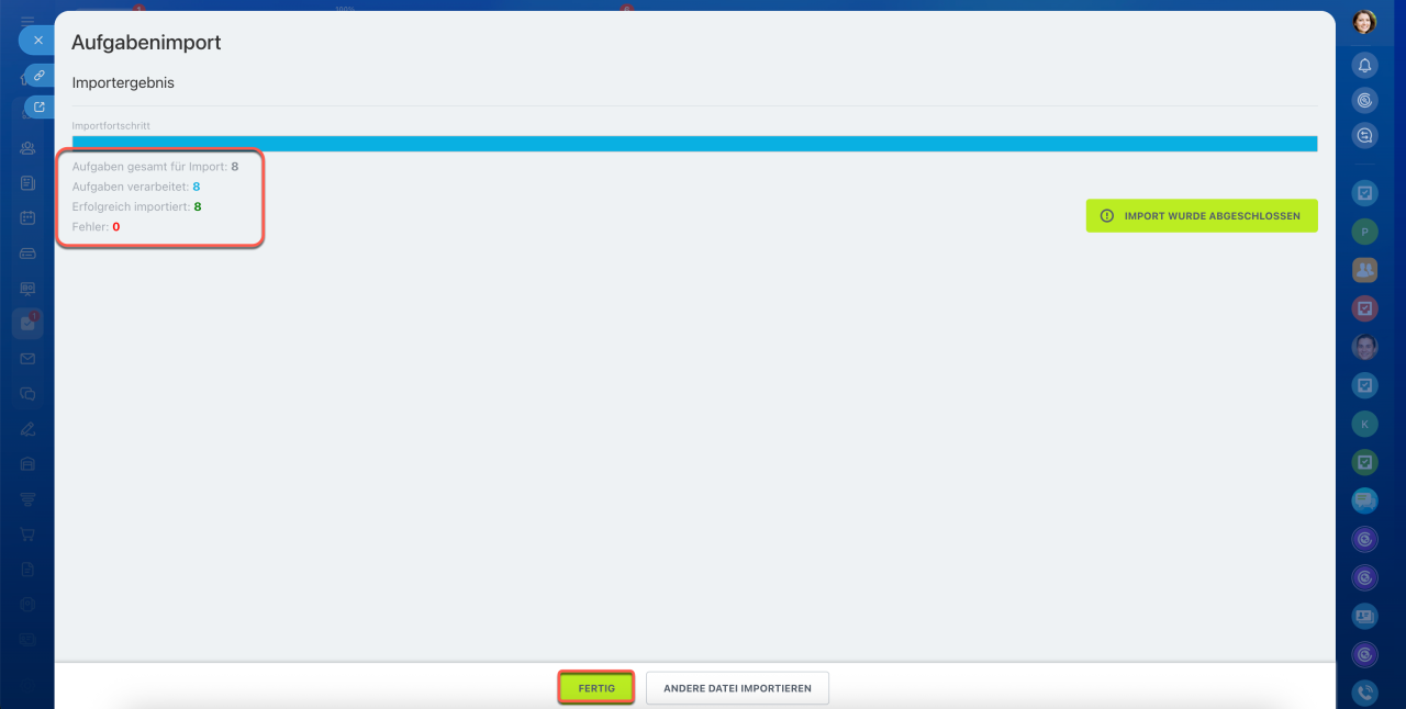 Nach Abschluss des Imports klicken Sie auf Fertig und prüfen Sie die hinzugefügten Aufgaben in der Liste.