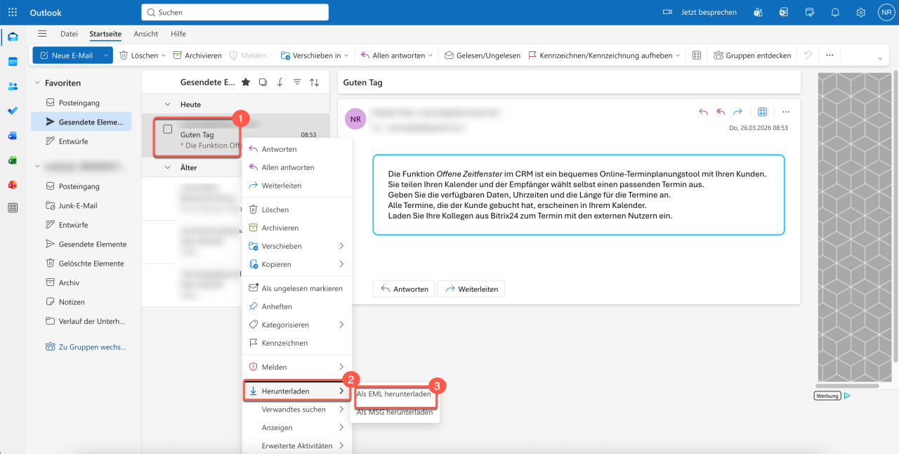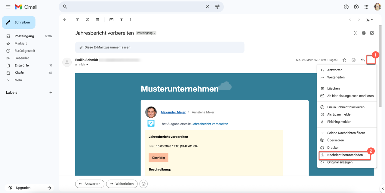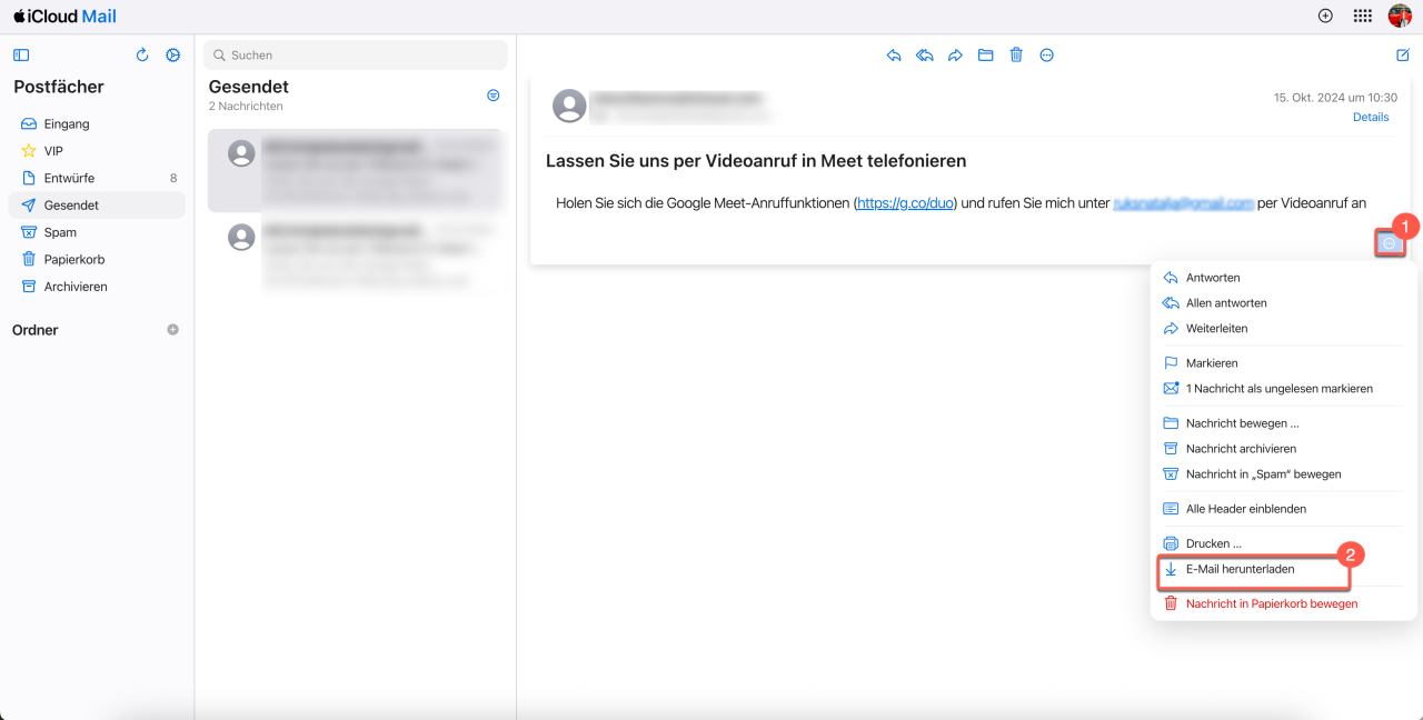 2. Wählen Sie Nachricht herunterladen. Die E-Mail wird automatisch im Format EML gespeichert.