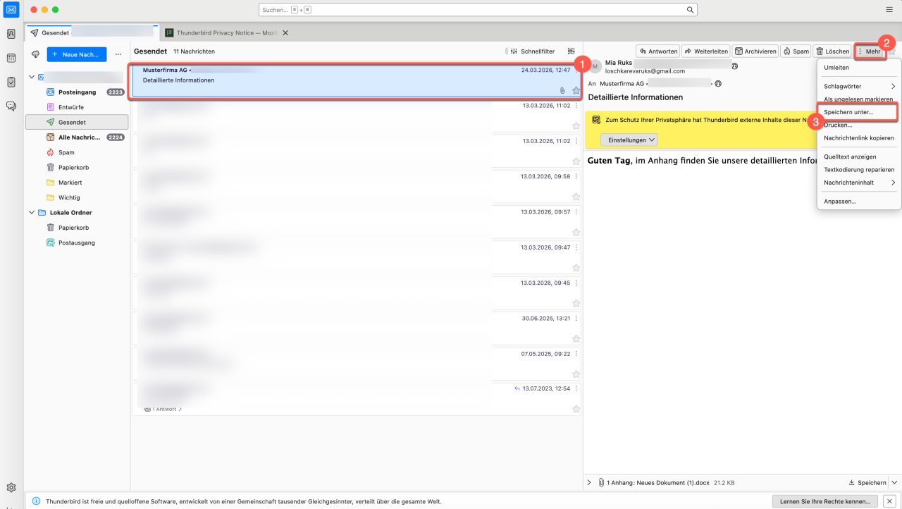 Um eine E-Mail im Format EML in Thunderbird zu speichern: