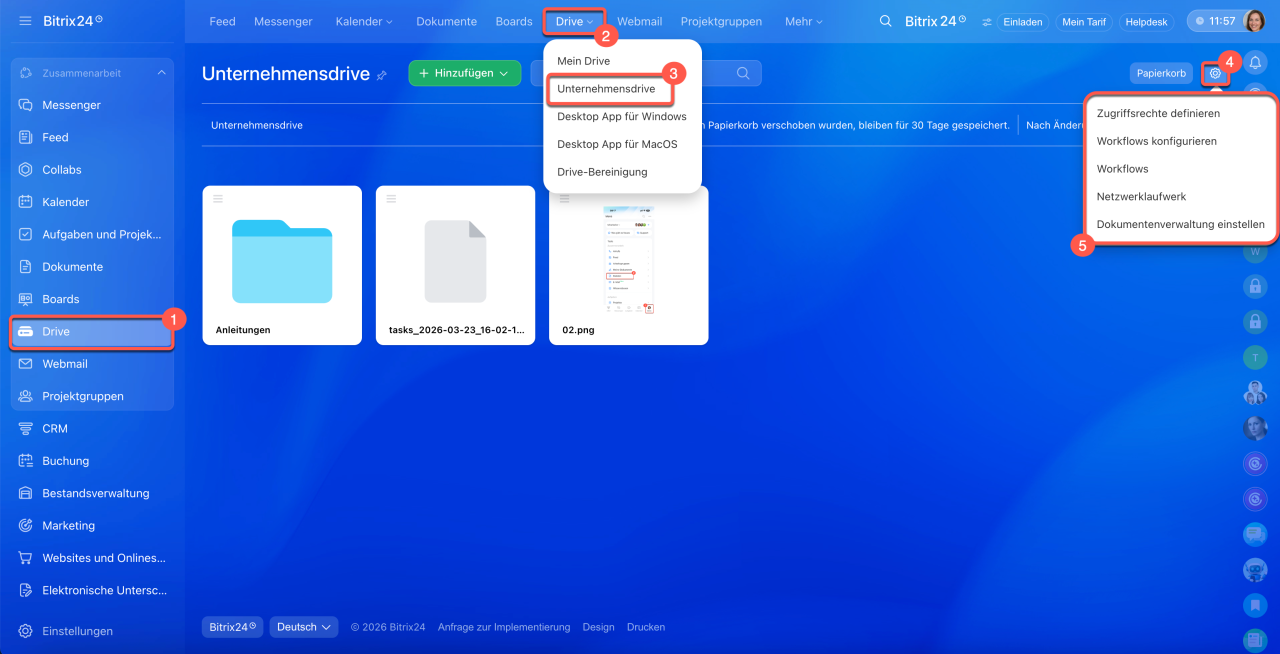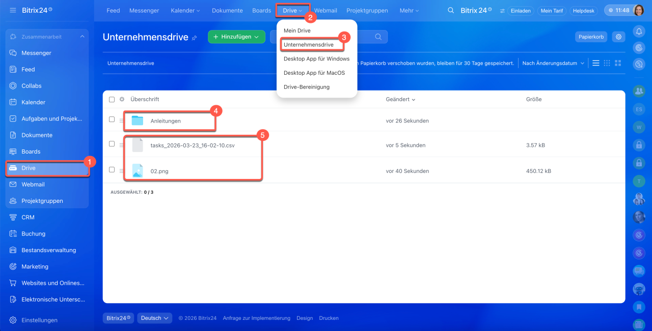 • Der Unternehmensdrive in Bitrix24 ist ein Cloud-Speicher für Arbeitsdateien wie Anleitungen, Dokumentvorlagen und andere Materialien. Er ist sowohl auf dem Computer als auch in der mobilen App von Bitrix24 verfügbar.