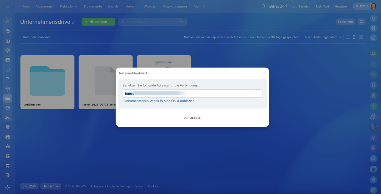 Netzlaufwerk. Kopieren Sie die Adresse, um den Drive als Netzlaufwerk mit dem Computer zu verbinden – er wird wie ein normaler Ordner im Explorer angezeigt. Alle Änderungen werden bidirektional synchronisiert: Nach dem Speichern eines Dokuments erscheinen die Änderungen sowohl auf dem Computer als auch in Bitrix24.