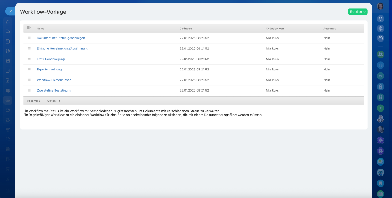 Workflows ermöglichen die Automatisierung von Dateiabläufen im Unternehmensdrive, z. B. die automatische Dokumentenfreigabe oder die Bearbeitung von Anträgen. Sie können Standard-Workflows hinzufügen, anpassen oder eigene Workflows erstellen.