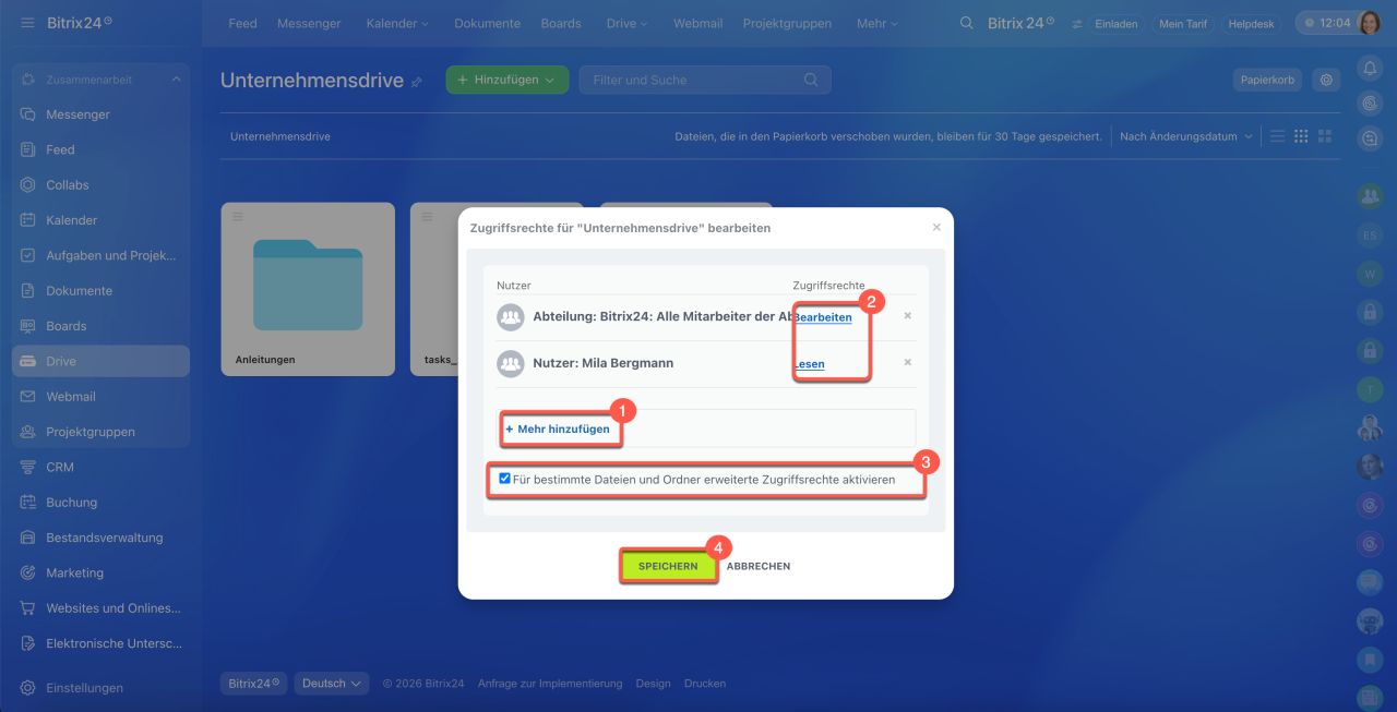 Standardmäßig hat der Administrator von Bitrix24 vollen Zugriff auf den Unternehmensdrive, während Mitarbeiter das Recht zur Bearbeitung haben.