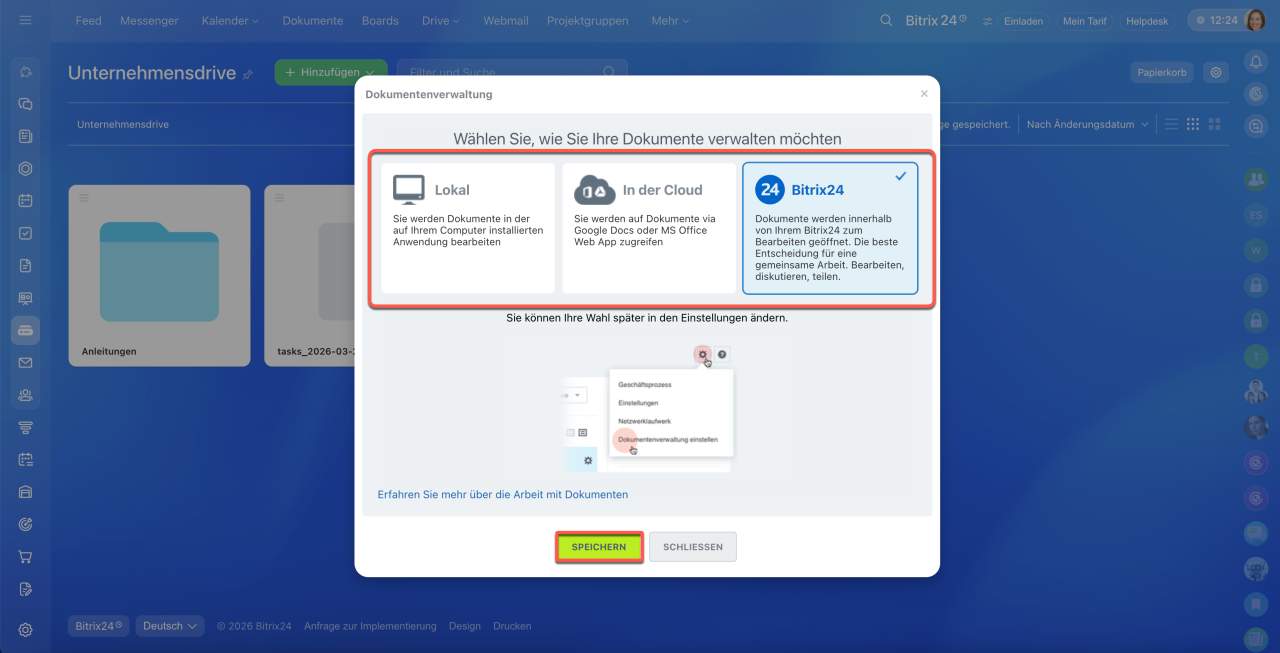 Dokumentenverwaltung einstellen. Wählen Sie die bevorzugte Methode: lokal, in der Cloud oder über den integrierten Editor von Bitrix24. Speichern Sie die Änderungen.
