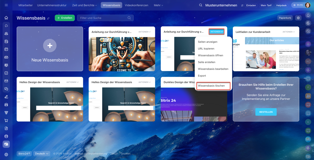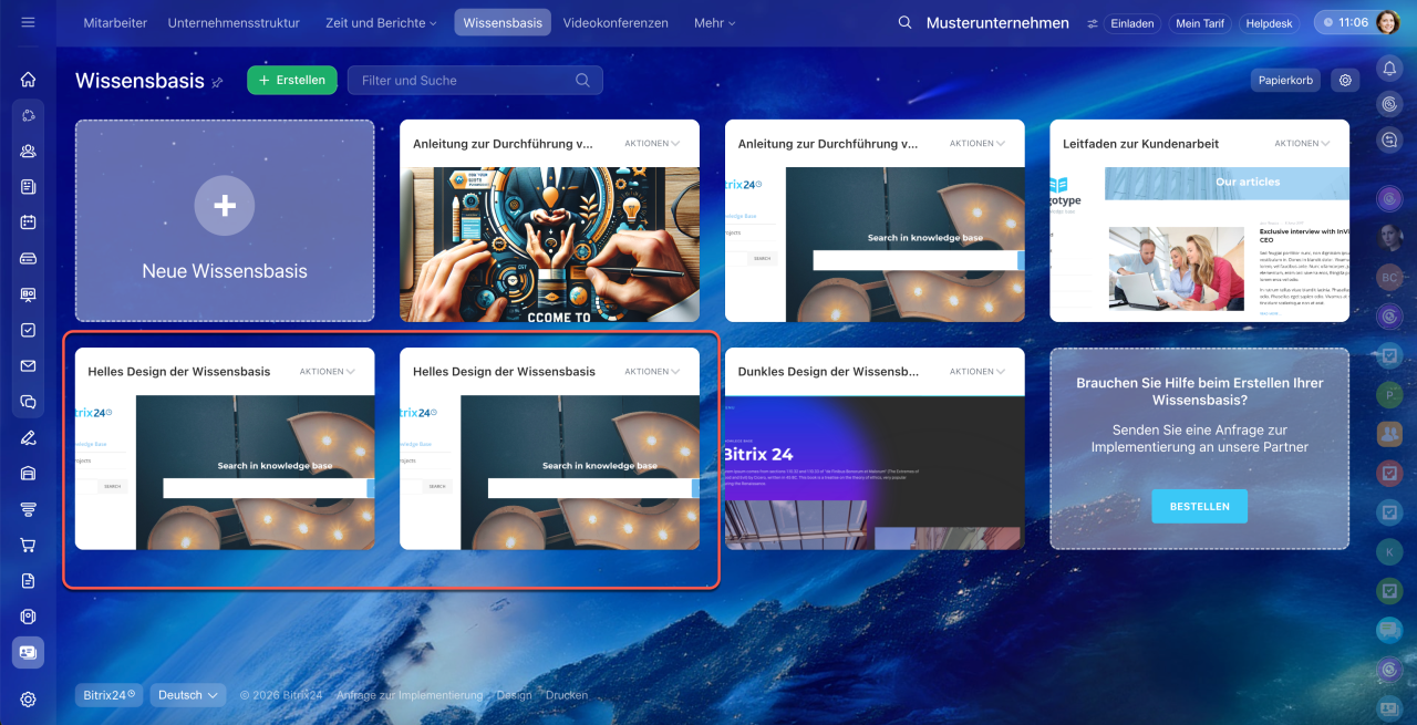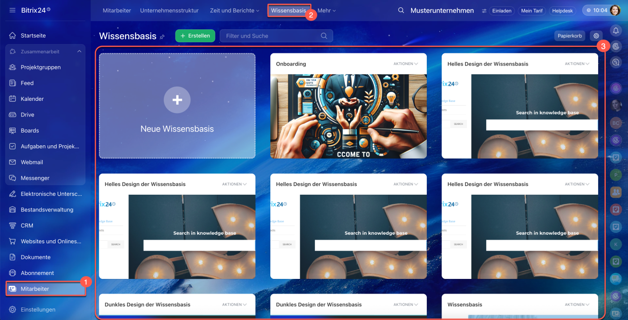 In Bitrix24 können Sie Wissensbasen erstellen – übersichtliche Online-Handbücher mit klarer Navigation und integrierter Suche. Sie eignen sich hervorragend zur zentralen Speicherung von Anleitungen, Richtlinien und anderen nützlichen Materialien.