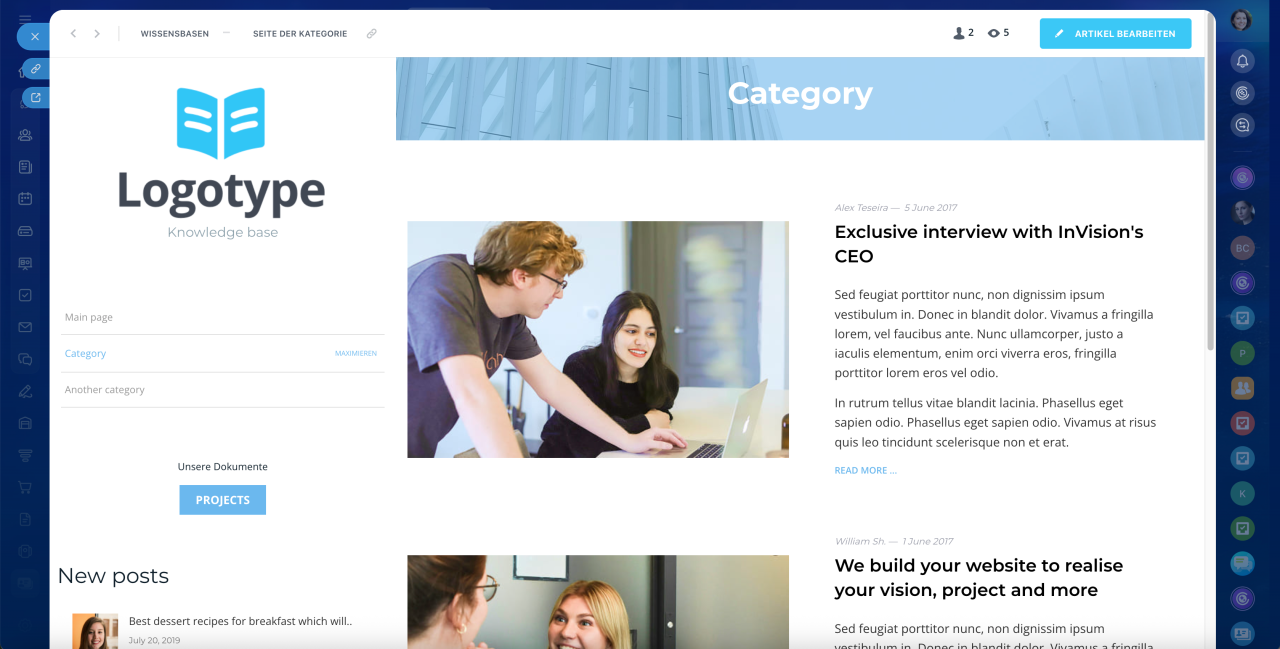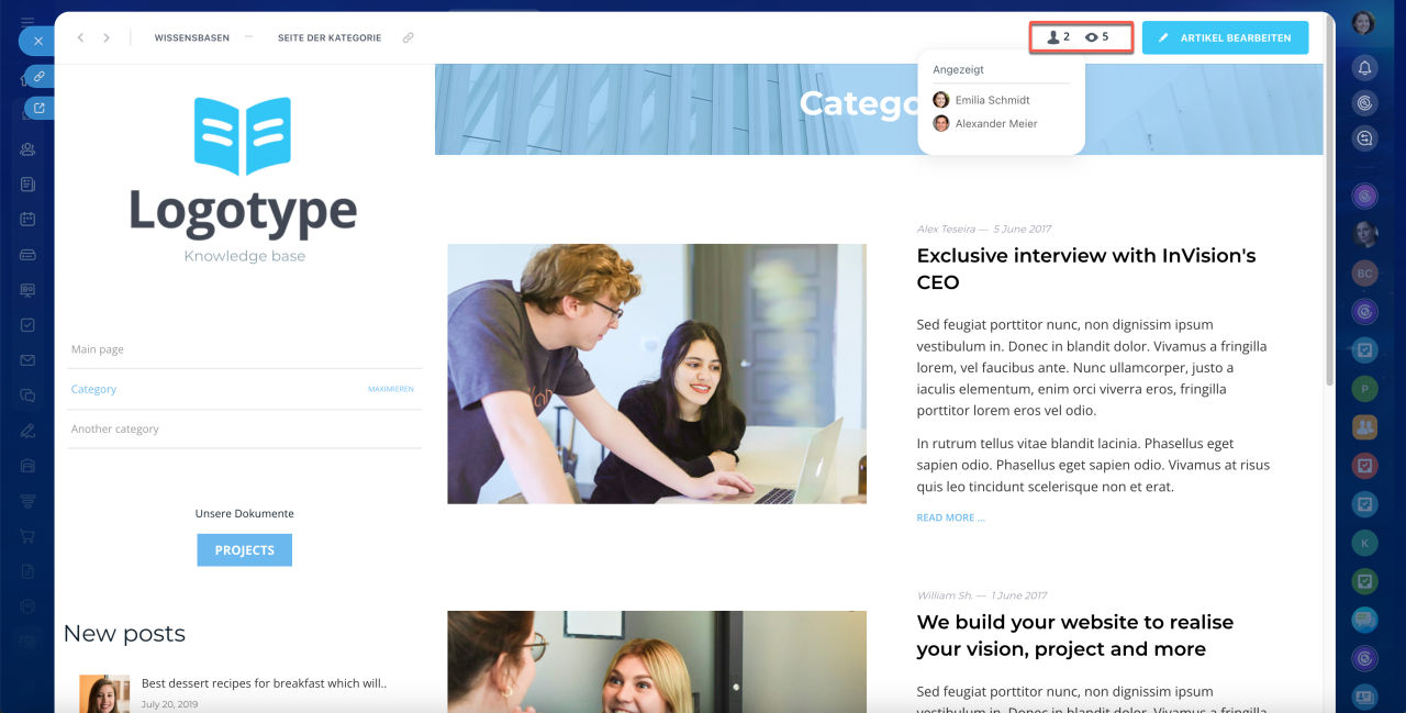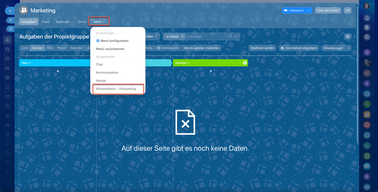 Die Wissensbasen lassen sich in Bereiche, Gruppen und Projekte integrieren, sodass Mitarbeiter die benötigten Materialien direkt dort öffnen können, wo sie für ihre tägliche Arbeit erforderlich sind. Beispielsweise können Sie im Bereich CRM einen Leitfaden zur Kundenbetreuung hinzufügen, während in einer Gruppe eine Anleitung zur Aufgabenübergabe zwischen Abteilungen sinnvoll ist.